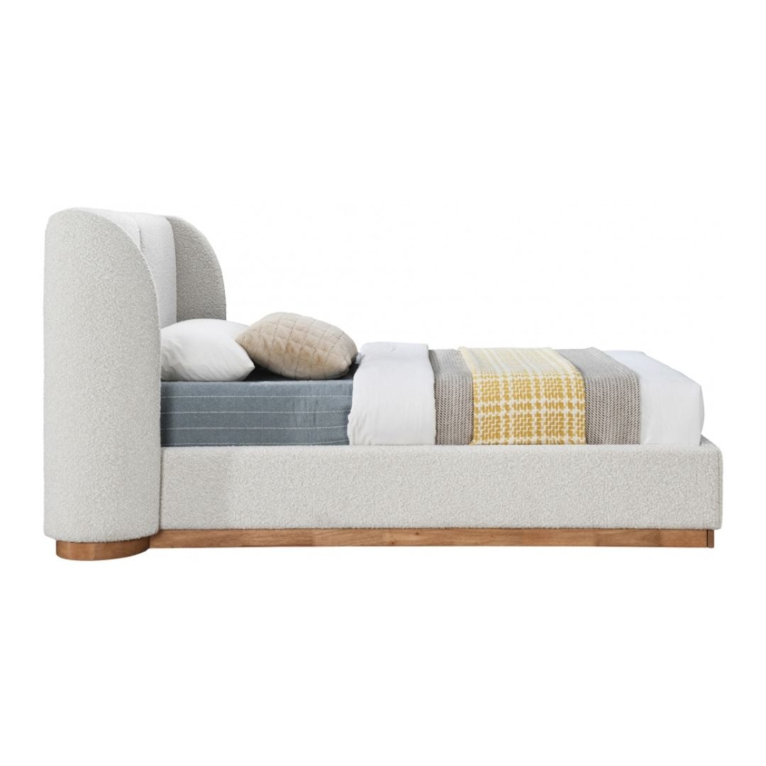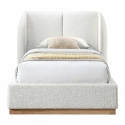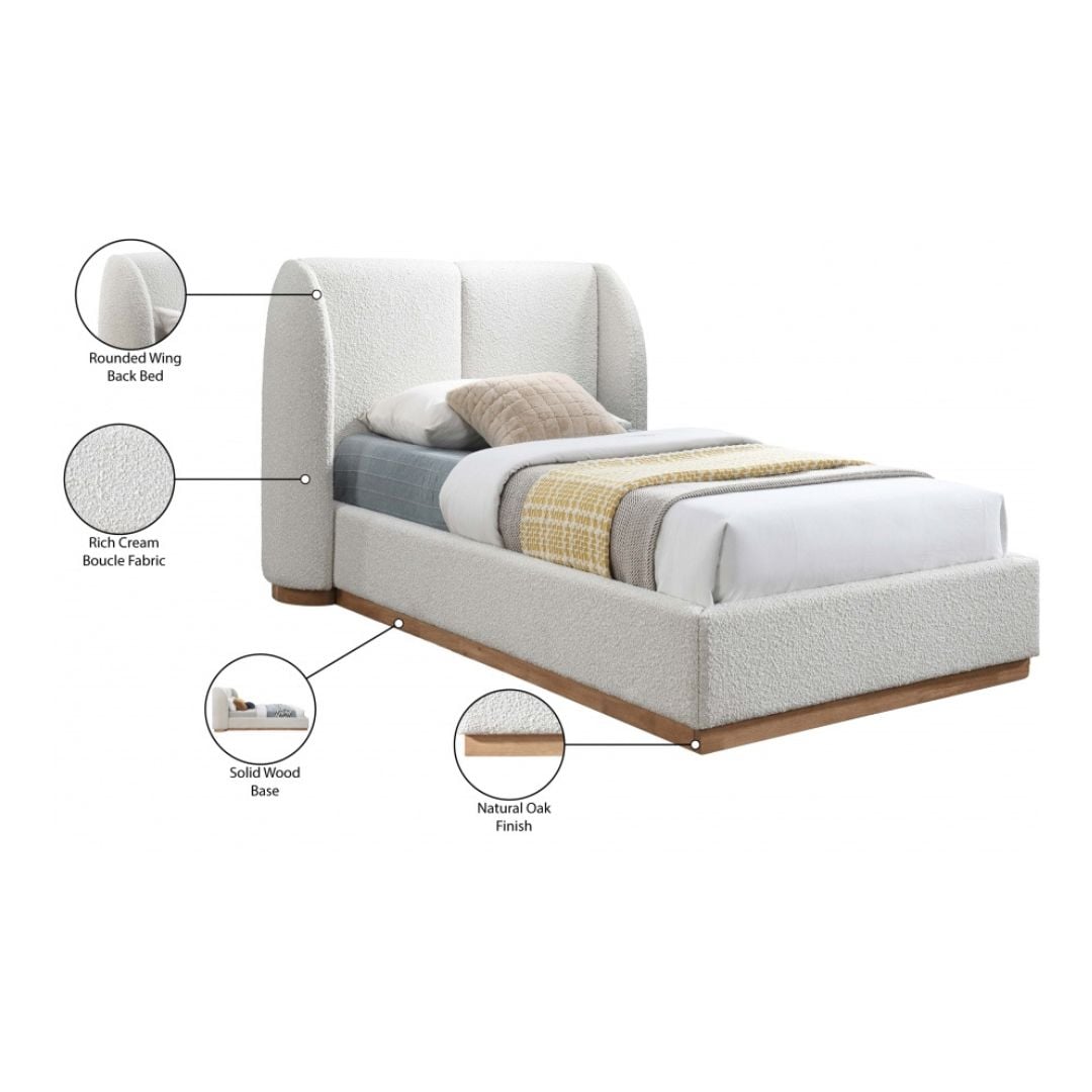Add showstopping appeal to your bedroom sanctuary with this Jardin boucle fabric full bed. Cream boucle fabric covers this full bed’s headboard and side rails, adding soft, sumptuous appeal to its all-over aesthetic. The winged headboard is softly padded for comfort against your back and neck while you lounge around, reading or watching television. A natura oak finish on the solid wood base adds a distinctly sophisticated finish. Use this art-deco style bed with just a mattress if desired; box springs are not necessary.
