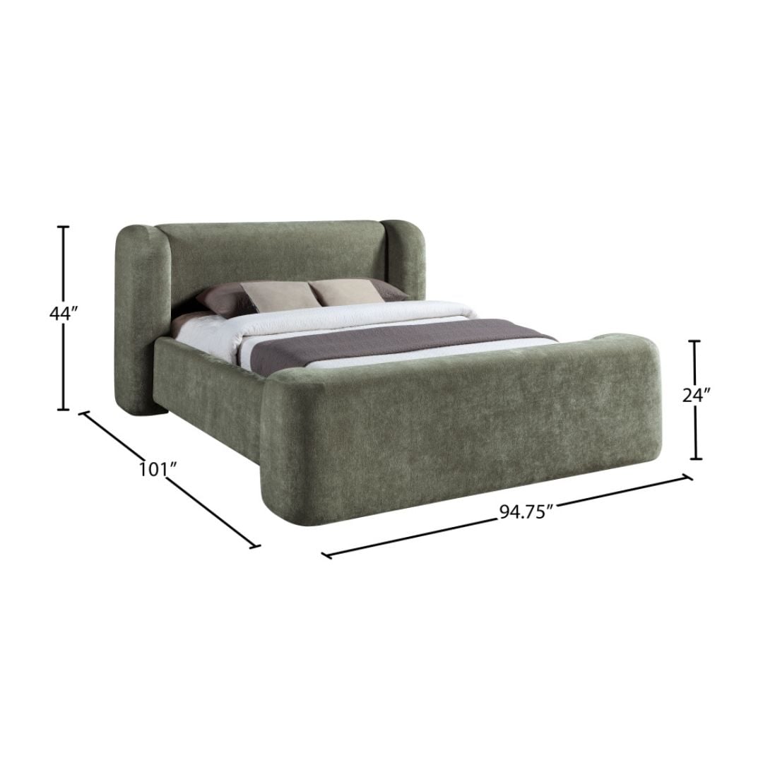 Dressed in soft green chenille, the Modena king bed blends bold curves with cozy texture for a striking yet inviting centerpiece. Upholstered in high-quality 570 GSM polyester chenille, its pillowy silhouette wraps fully around the headboard and footboard, delivering plush comfort and sculptural presence in equal measure.