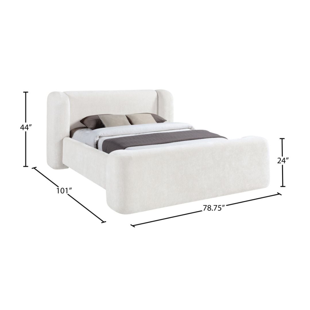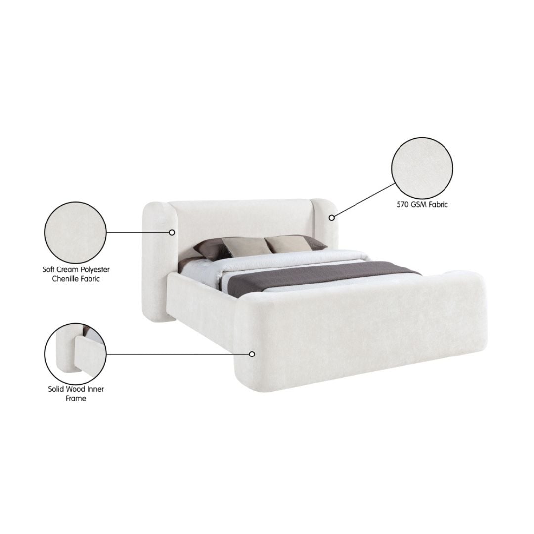 Dressed in soft cream chenille, the Modena queen bed blends bold curves with cozy texture for a striking yet inviting centerpiece. Upholstered in high-quality 570 GSM polyester chenille, its pillowy silhouette wraps fully around the headboard and footboard, delivering plush comfort and sculptural presence in equal measure.