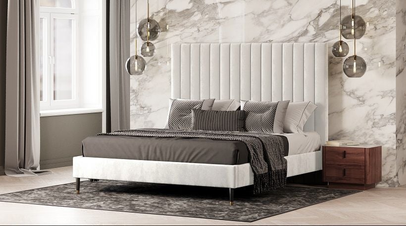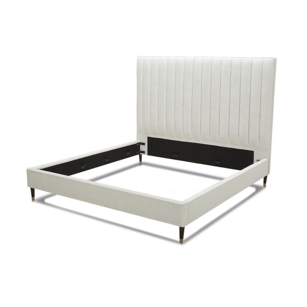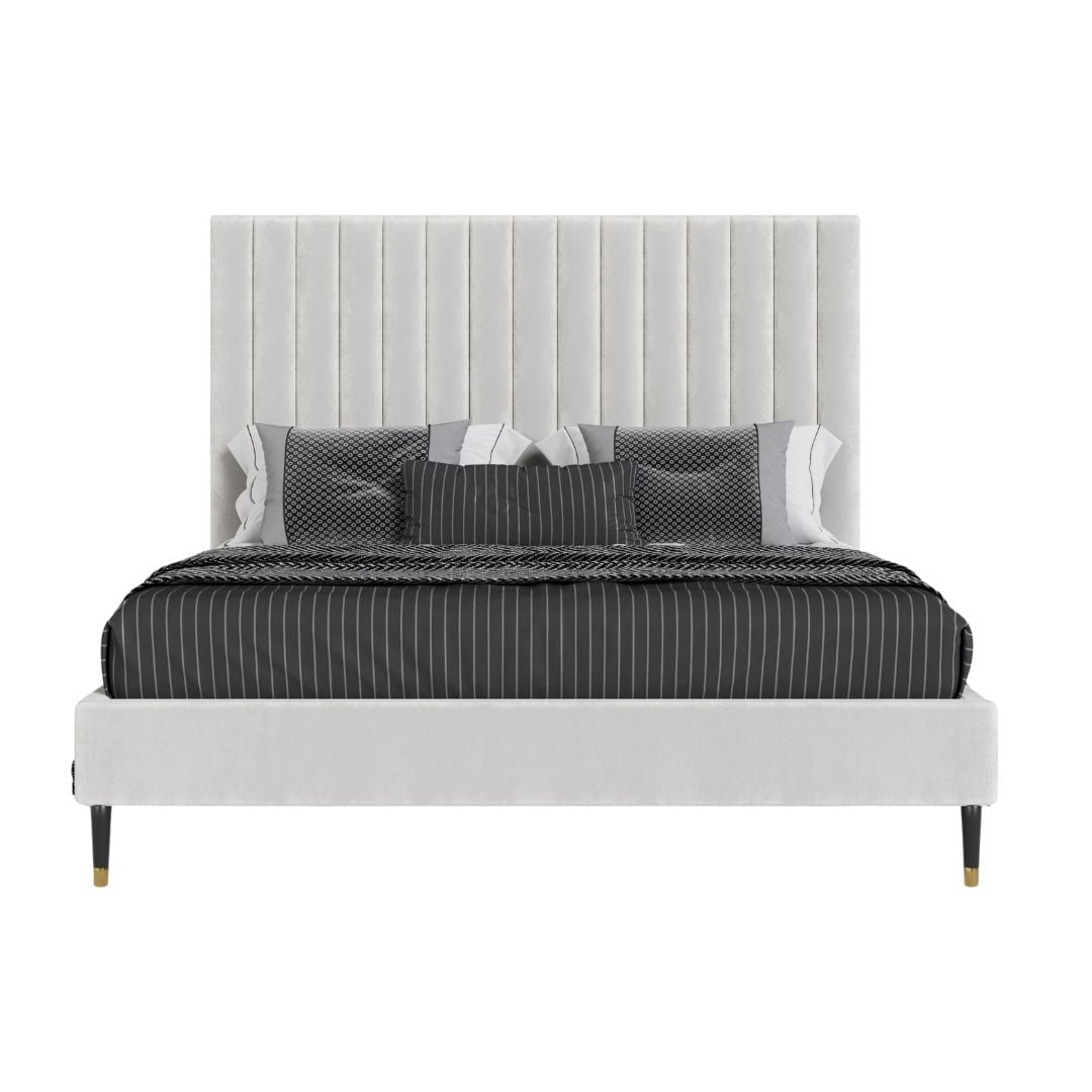Create a simple yet elegant style in your bedroom with the Modrest Hemlock Contemporary White Fabric Bed. Donning a tall headrest with a pleated design in front, it is upholstered in soothing white velvet fabric. Complementing the headrest is a sunken mattress frame with slats to ensure good aeration and to keep the mattress in place even if you move a lot while asleep. This modern bed serves your sleeping needs perfectly and adequately, making your bedroom a quiet resting area. Tapered legs with gold rings on each end provide sturdy support.