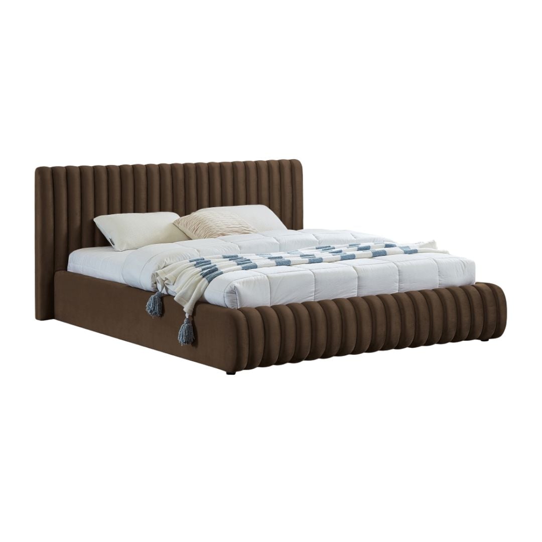 Bring upscale modernity to your bedroom space with this stunningly elegant, sumptuously appointed Nico bed. This queen bed has deep vertical channel tufting on the headboard and footboard, adding textural beauty that instantly catches the eye. The entire bed is upholstered in brown velvet for a luxurious design that makes the bed the star of the show. A padded headboard supports your back while you binge watch TV in bed or read a book.