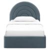 Bring sweeping lines and cozy comfort to your bedroom with the Solana Twin Velvet Platform Bed. Featuring a captivating arch-shaped headboard, the design showcases three layered, semi-circular padded segments that add depth and dimension to the look. Upholstered in luxe, stain-resistant performance velvet, the twin size headboard’s plush layers create a striking focal point that is both modern and calming. Supported by sturdy wood slats, the twin size platform bed frame offers excellent mattress support without the need for a box spring. The upholstered plinth-style base mirrors the soft, cushioned look of the rounded headboard, adding to the bed’s contemporary appeal. Whether you’re redesigning a guest room or college dorm, or transitioning to a twin size kid’s bed, the Solana twin upholstered bed frame is the perfect blend of artistic style and functionality. Assembly required. Weight Capacity: 800 lbs.