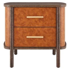 The Coralie Nightstand blends bold texture and refined form to create a striking modern accent for any bedroom or living space. Wrapped in smooth vegan leather with rich brown tones, this 2-drawer nightstand features a softly curved silhouette and wood grain drawers covered in vegan leather, for a vintage-inspired look. The generously sized drawers provide practical storage for bedside essentials, with gold-finished handles adding a sophisticated touch. Designed with stability and versatility in mind, Coralie works equally well as a nightstand, modern end table, or stylish side table for storage and organization. The floor glides on the legs of this bedside table to help protect your floors and allow easy positioning. Assembly required.