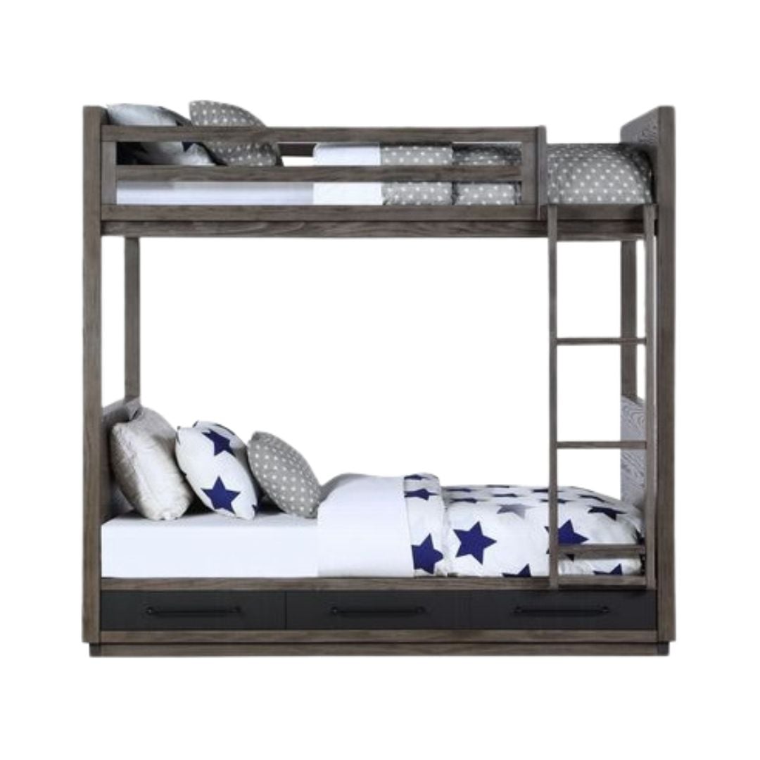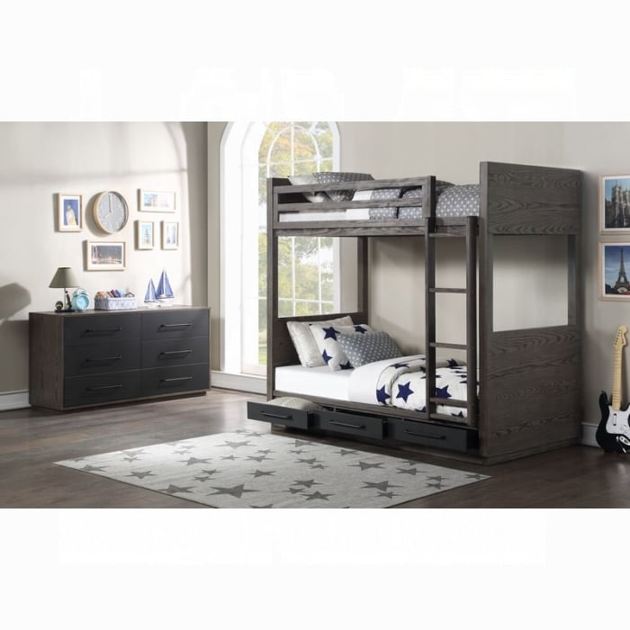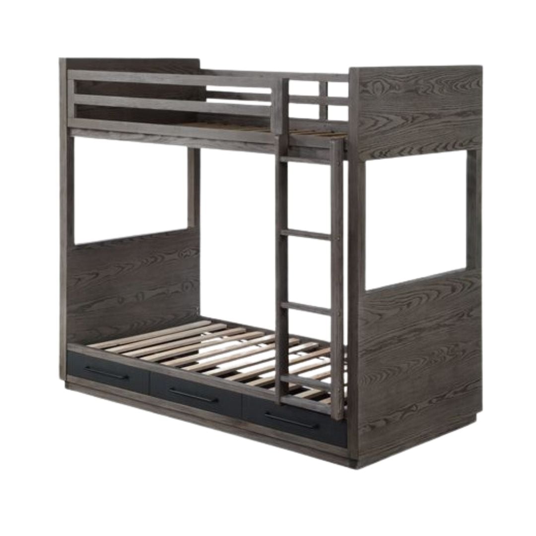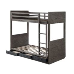 Maximizing the sleeping capacities of your little one’s bedroom with the Estevon?˜bunk bed. Whether you’ve got two children sharing a bedroom or one little one that loves sleepovers, this twin over twin bunk bed is a perfect choice. The gray oak finish is modern and can easily blend in with various color schemes. No need for bunkie boards, the bunk bed includes a 14+14 slat system and a fixed ladder. The bed features three drawers to help your little ones keep organized.?˜