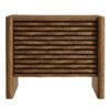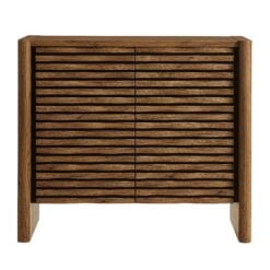 Simple in purpose, the Emric Wave Cabinet brings a soft, sculpted feel to functional storage. Made from a laminated wood blend with a smooth finish, this accent cabinet features slatted doors with a subtle wave design resting on a black backdrop that adds depth and movement. Two hinged doors open to reveal interior shelving, ideal for storing anything from linens to serveware. With thick side panels that extend to the floor, this buffet cabinet rests on a solid base that feels grounded from every angle. Whether styled as a small sideboard, or storage chest in a living room or hallway, this modern floor cabinet brings character and convenience to any space. Includes foot glides for floor protection. Assembly required.