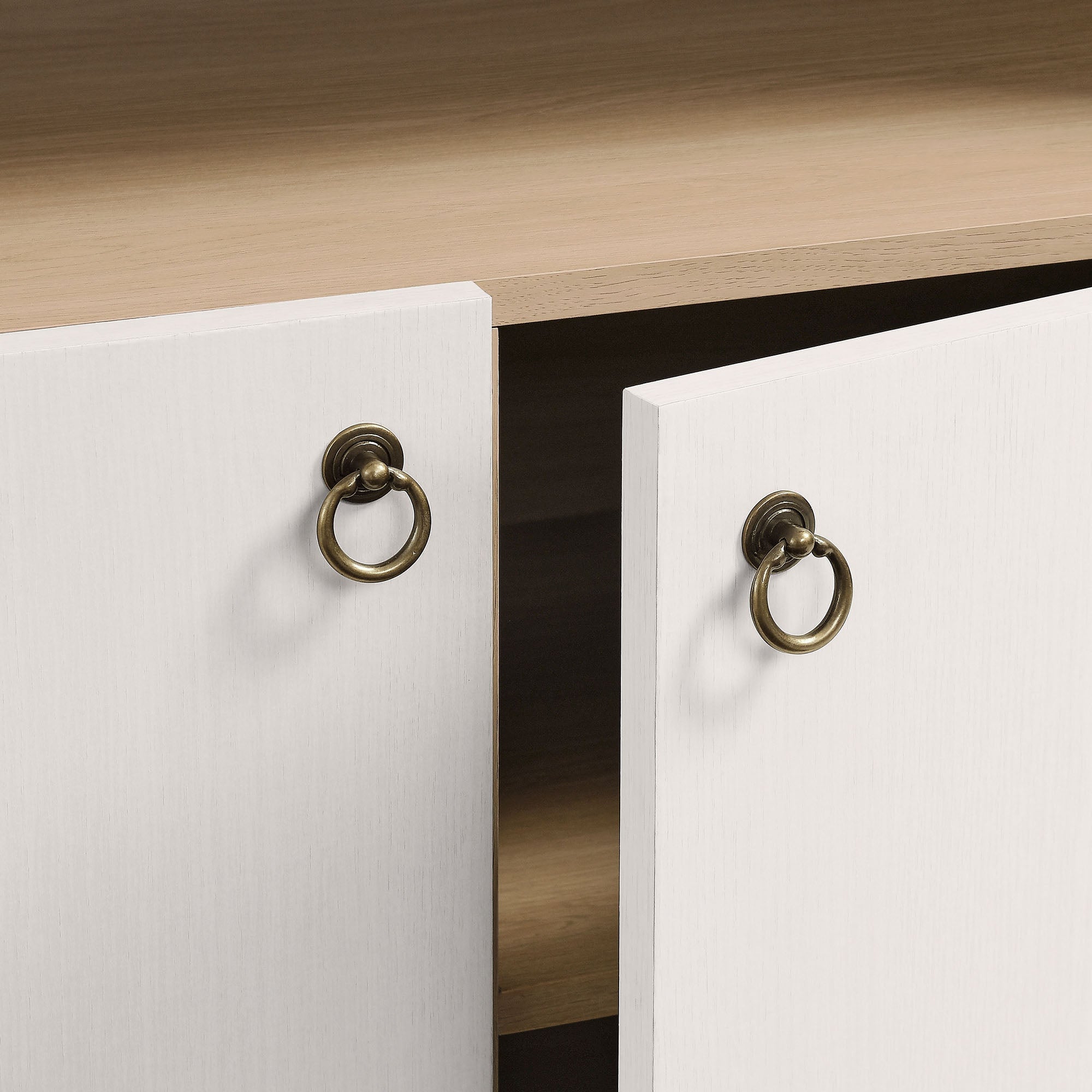 The Nolan Display Cabinet combines functional storage versatility with a charming modern farmhouse style. Crafted with a beautiful wood grain laminate, the chic design flaunts subtle edge trimming and an elegantly rounded, arched top shelf. Supported by tapered wood legs, the Nolan tall storage cabinet combines open shelving with concealed storage. The upper section includes two adjustable shelves flanked between two fixed shelves, perfect for displaying decor and books. The lower section is enclosed by two solid doors, which open to reveal two adjustable shelves inside, creating four compartments for additional storage. Complete with soft-close hinges and metal ring pull handles with a brushed gold finish, this wood storage cabinet is as stylish as it is practical. Perfect for your living room, hallway, or dining area, this arched bookcase effortlessly adds an air of sophistication and vintage allure to your home. To protect your flooring, the Nolan Wide Storage Cabinet comes equipped with non-marking foot pads. Assembly required. Weight Capacity of each shelf: 44 lbs