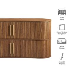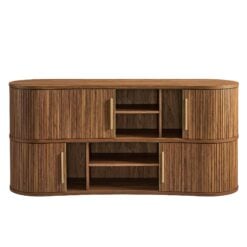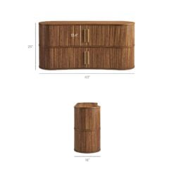 Designed as a versatile storage solution with sculptural appeal and gold colored door pulls, the Radcliffe Fluted Sideboard Buffet Cabinet brings rhythm, movement, and modern functionality to living and dining spaces. This 63″ sideboard features a gently curved silhouette wrapped in vertical fluting, creating a refined profile that feels architectural yet approachable. Two levels of sliding tambour doors glide smoothly to reveal adjustable interior shelving with cable management, offering flexible storage for dinnerware, media components, office essentials, or everyday items. The curved cabinet form softens the overall footprint while maximizing usable storage behind closed doors. Suitable for use as a dining room buffet, living room credenza, media console, or entryway storage cabinet, Radcliffe blends mid-century modern influence with contemporary versatility. Assembly required.