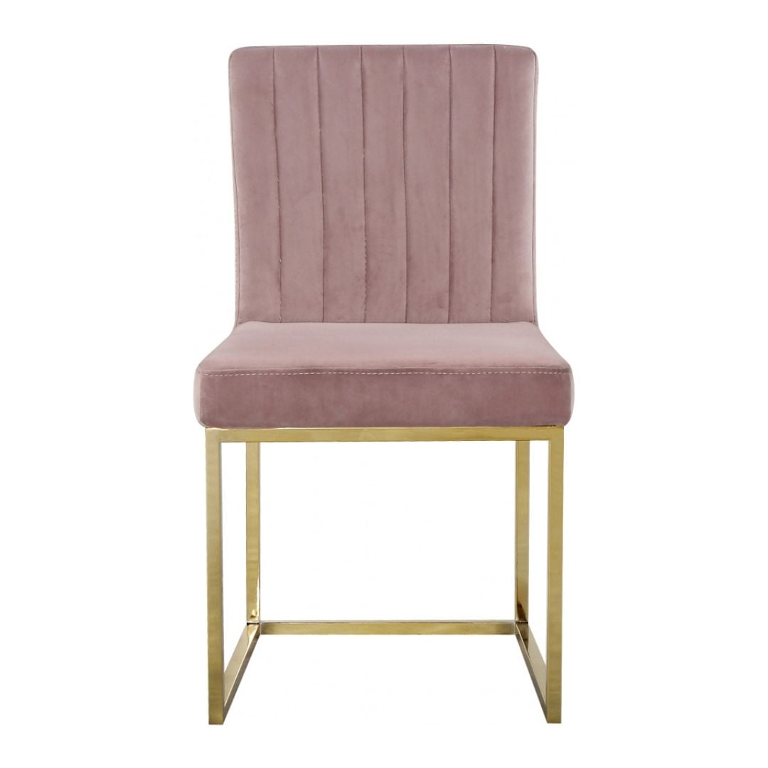 Take dining to a posh new level with this Giselle Pink Velvet Dining Chair. A boxy design makes it a nice addition to contemporary spaces, and its armless design makes it easy to get into and out of with ease. The seat and back are upholstered in rich pink velvet for a lavish vibe and a pop of sumptuous color to liven up your room, and both are padded well to make sure diners stay comfy while they enjoy their meal. The metal frame is finished in gold for added beauty and aesthetic appeal.