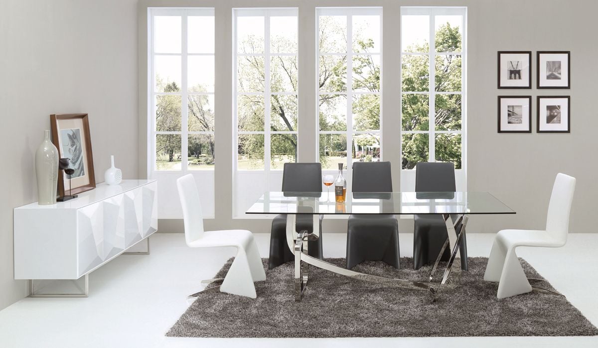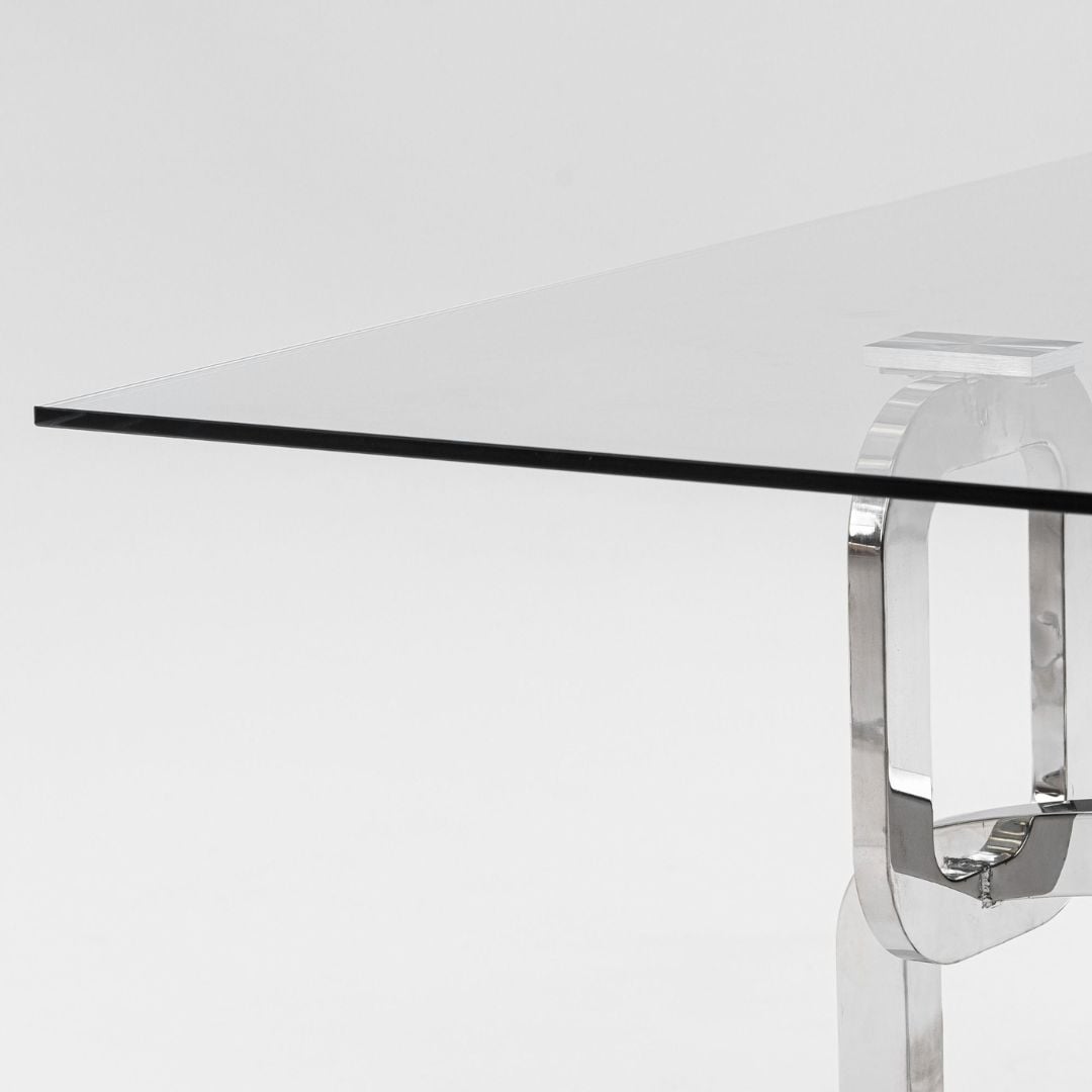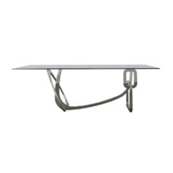 The Modrest Adelaide Modern Stainless Steel & Glass Dining Table is an elegant display of artistry. An eye-catching stainless-steel base with abstract architecture creating a unique and stylish piece. A glass top floats on the top of this enchanting base elevating this to a luxury table. Pair with a white vegan leather dining chair for s striking styling that is sure to impress.