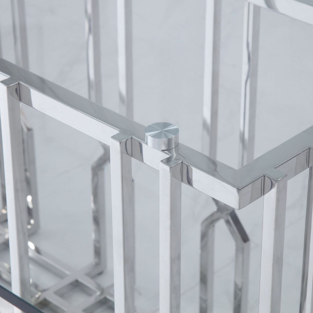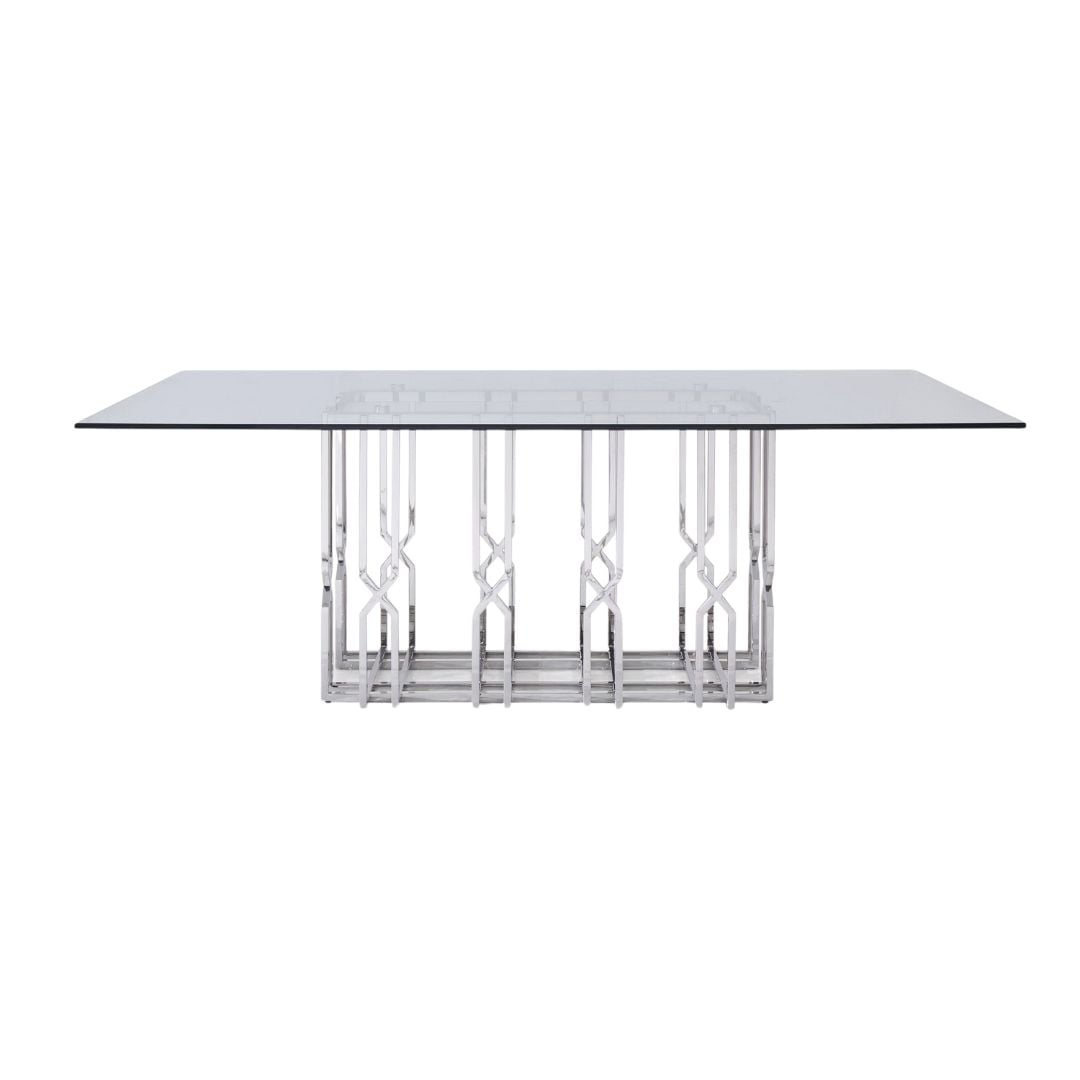 The angular and grid-like base of the chrome Ericson Dining Table is engaging and mesmerizing. The thick clear glass top makes the piece a modern beauty while the elegant framework of the base adds a contemporary style.