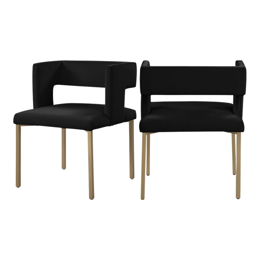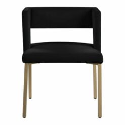 Add the Caleb black velvet dining chair to your dining room for the ultimate in comfort and style. This chair has a square seat and low back which is open at the bottom to the rear and on the sides. Four brushed gold square iron legs provide support and stability, while the chair’s soft velvet and cushioning offer an air of luxury. Several available tables make a perfect companion to this contemporary piece.