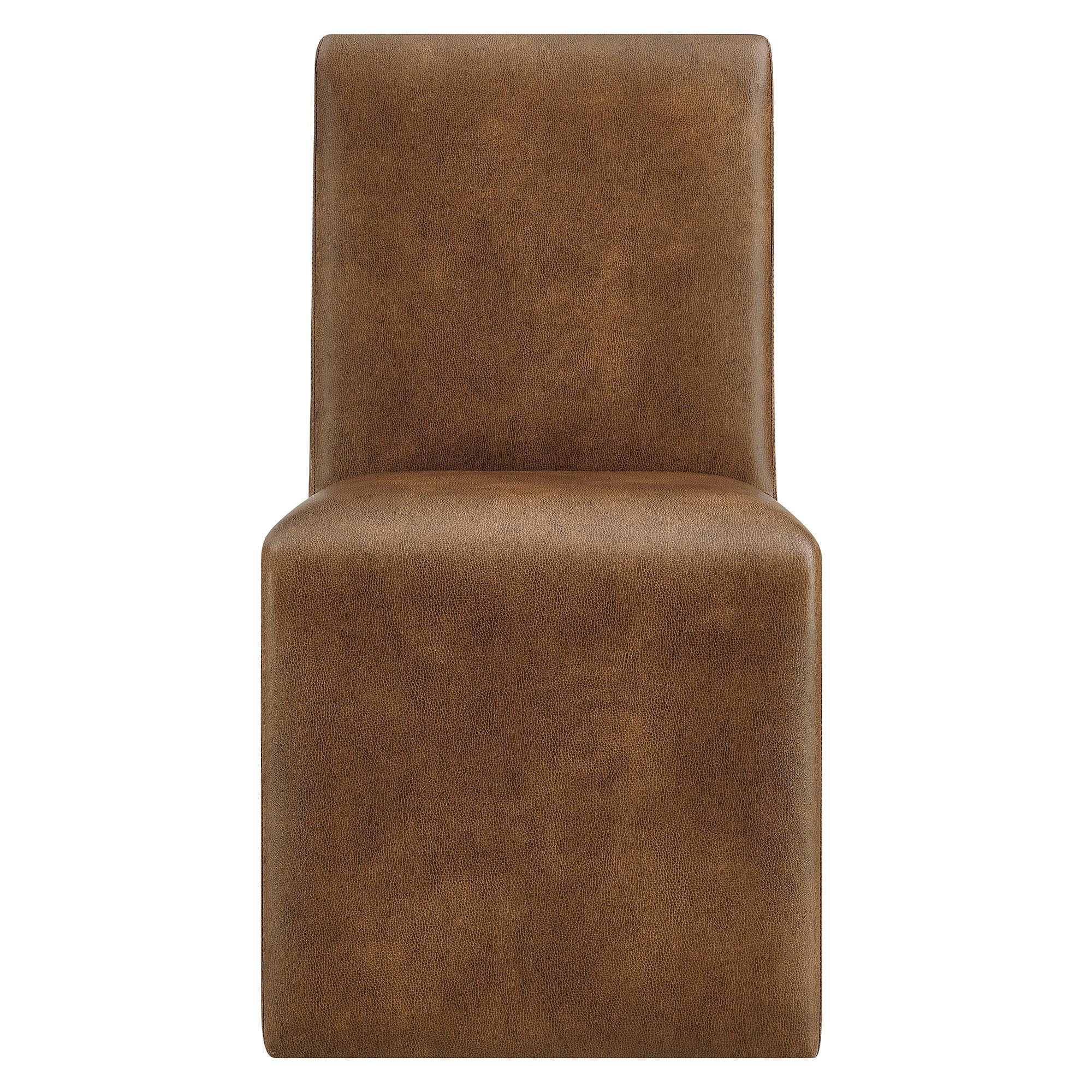 With its smooth curves and continuous form, the Emory Faux Leather Dining Chair brings an elegant, contemporary feel to any space. Wrapped entirely in premium pebbled vegan leather, this single slipper dining chair features a tall, gently angled backrest that provides support while maintaining a clean, minimal profile. The padded seat flows into the base with a waterfall edge that adds both comfort and balance. Its armless shape and crisp lines make it easy to style around a dining table or as a padded bedroom chair, or living room accent chair. Built with a sturdy internal wooden frame and finished with non-marking foot pins, Emory arrives fully assembled and supports up to 300 lbs.