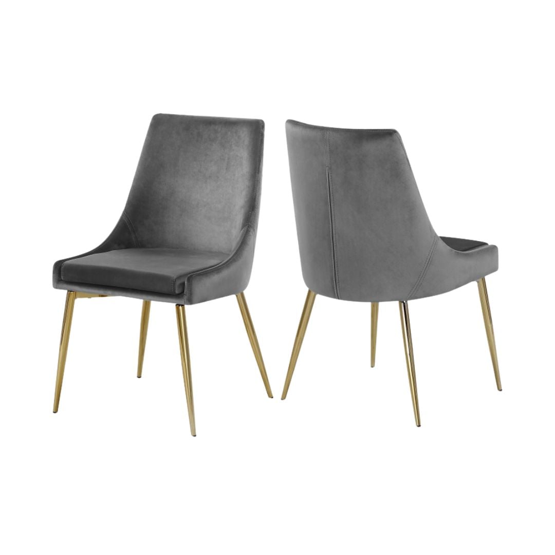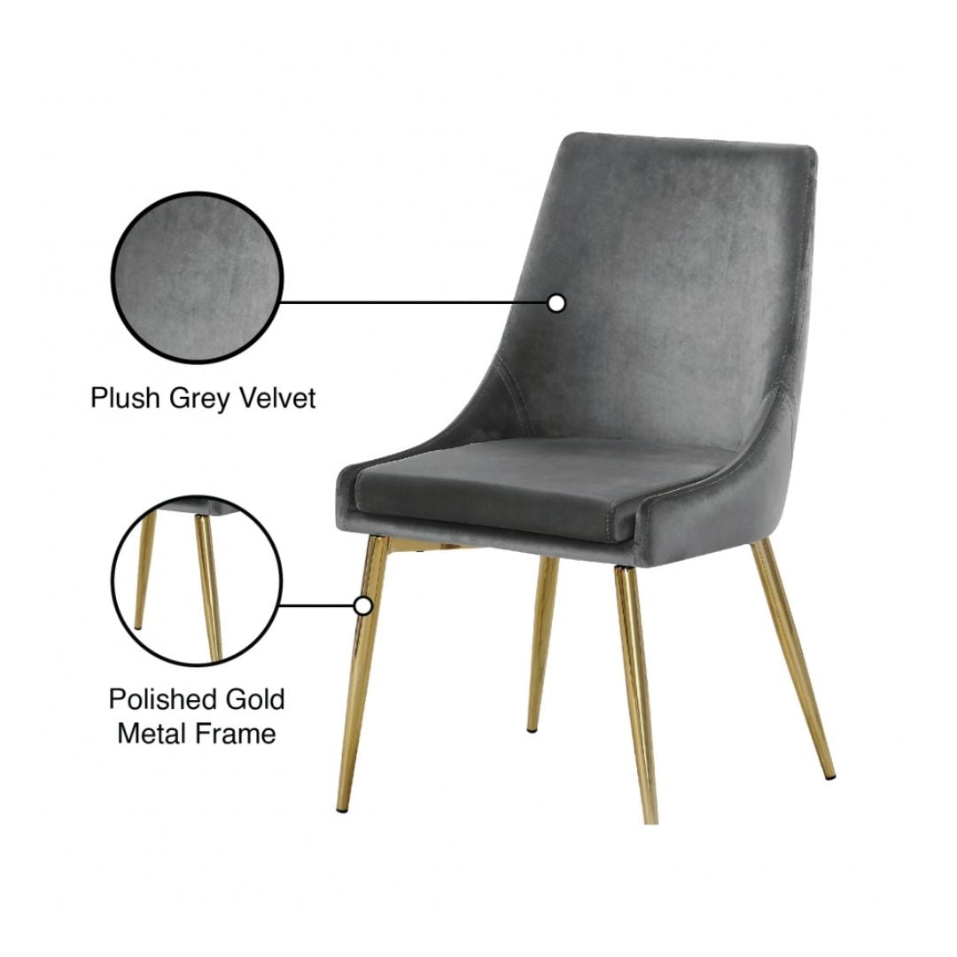 Extend contemporary panache to the dining room with this Karina Grey Velvet Dining Chair. This dining chair features upholstery in sleek grey velvet for a modern look and has an armless design for a retro-inspired vibe. The stark grey color makes it easy to blend in with your existing decor colors or make a contrasting statement with ease. The slanted legs of this chair are gold finished for added modernity and to provide reliable and durable support while you dine.