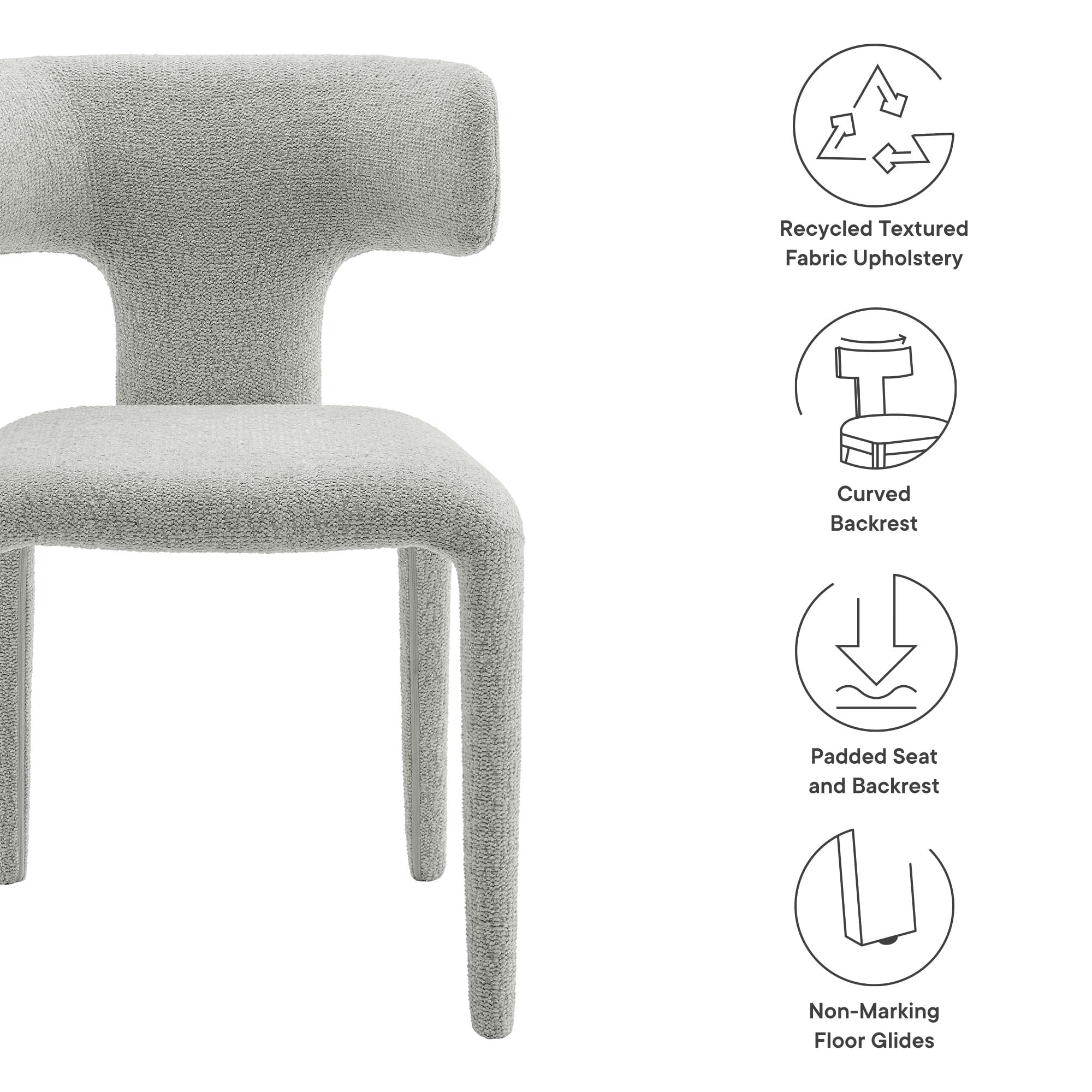 Introduce a sophisticated yet inviting charm to your dining or living area with the Stellan Boucle Dining Chair. Fully covered in luxurious boucle fabric, this upholstered chair exudes cozy elegance with its textured depth and tactile appeal. Made from recycled plastic bottles, the upholstery fabric is also OEKO-TEX® STANDARD 100 certified. The curved back dining chair’s sculptural silhouette is defined with rounded edges and splayed back legs, creating a modern yet timeless profile. Built on a sturdy metal frame hidden beneath the plush padding, this boucle side chair balances form and function beautifully. Non-marking floor glides protect your floors. Perfect as an armless dining chair, accent chair, or even a stylish guest or desk chair, Stellan is a versatile addition to any contemporary or modern space. Weight Capacity: 300 lbs.