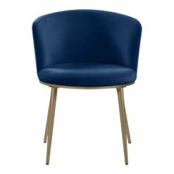 Enhance your decor with the Skylar navy velvet dining chair, due to its petite silhouette and artistic style. A soft round cushion and gently curving cushioned back give this chair an ageless quality that belies its contemporary design. A brushed gold base is supported by four tapering gold legs, and it weighs only 11 pounds overall. Easily paired with any of several available tables, this chair is equally well-suited to use in a conversation grouping.