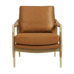 Enhance your living space with the Langford Vegan Leather Living Room Chair, where elegance meets comfort in a timeless mid-century modern design. Covered in sleek faux leather, this upholstered accent chair adds a sophisticated touch with its inviting, smooth texture and resilient finish. Brass accents on the legs and corners of the swooped armrests bring a refined charm, highlighting the sitting chair’s clean lines and classic structure. Crafted with a solid kiln-dried wood frame, the accent chair with arms is as durable as it is stylish, offering long-lasting support and comfort. Langford’s cushions provide a consistent look and feel, ensuring this modern armchair remains as cozy as it is chic. Perfect for reading nooks, living rooms, or as a striking bedroom accent, the Langford Reading Nook Chair combines mid-century modern flair with modern functionality. Weight Capacity: 300 lbs.