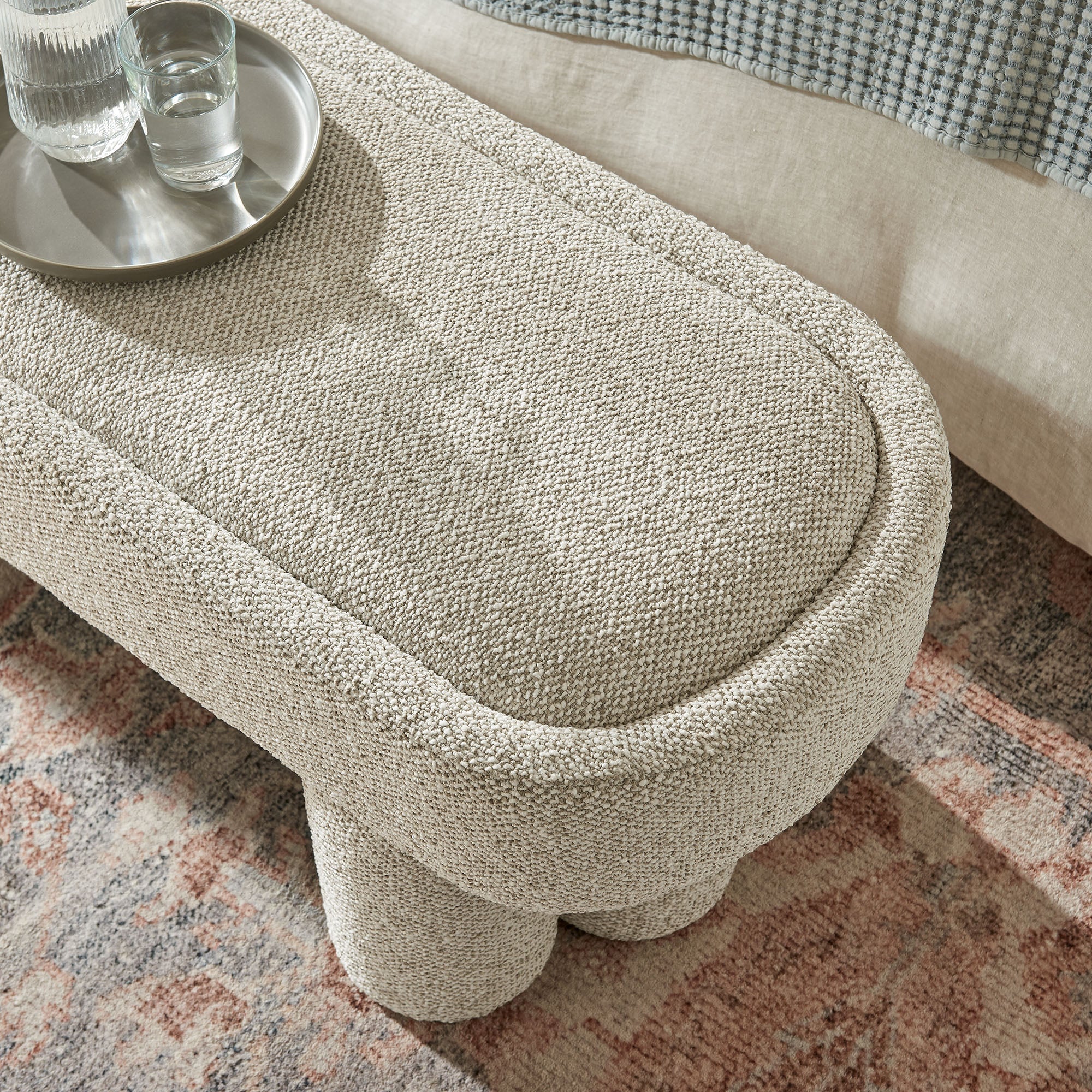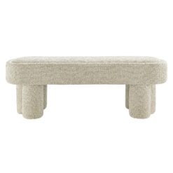 Soft curves and bold geometry define the Mossi Fabric Bench, a modern accent piece with sculptural appeal. Upholstered in boucle fabric, this 52-inch oval bench has a nubby, textured look and an inset seat cushion for added comfort. Resting on cylindrical legs resembling a clover-like base, Mossi makes a striking design statement while providing sturdy support. Whether styled at the end of a bed, in an entryway, or as a lounge bench in the living room, this upholstered boucle bench combines practicality with contemporary artistry. Weight Capacity: 300 lbs.