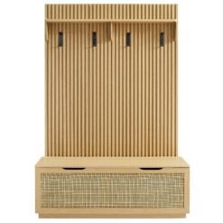A complete entryway solution, the Soma Fluted Hall Tree with Rattan Storage Bench combines natural texture, functional design, and a streamlined silhouette. This two-piece entryway storage set features a vertical slatted coat rack with four sturdy hooks and a top display shelf, anchored by a coordinating storage bench. Crafted with a warm wood grain finish and faux rattan panels, the Soma entryway bench with storage adds an organic touch to modern, transitional, or Scandinavian-inspired interiors. This rattan bench opens with two cut-out handles and a flip-top hinge, revealing a divided interior with deep compartments for shoes, blankets, or everyday items. Soft-close hinges provide ease of use, while a flat base offers a solid, grounded profile. On top, the fluted hall tree panel provides ample space to hang coats, bags, and accessories, with wall-mount brackets granting secure installation. Together, this hall tree with rattan bench and shoe storage offers a stylish 3-in-1 entryway storage solution—perfect for mudrooms, hallways, or foyers. Assembly required. Bench Weight Capacity: 209 lbs.