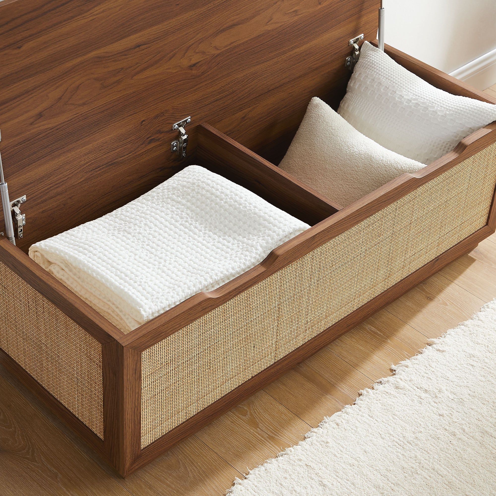 A complete entryway solution, the Soma Fluted Hall Tree with Rattan Storage Bench combines natural texture, functional design, and a streamlined silhouette. This two-piece entryway storage set features a vertical slatted coat rack with four sturdy hooks and a top display shelf, anchored by a coordinating storage bench. Crafted with a warm wood grain finish and faux rattan panels, the Soma entryway bench with storage adds an organic touch to modern, transitional, or Scandinavian-inspired interiors. This rattan bench opens with two cut-out handles and a flip-top hinge, revealing a divided interior with deep compartments for shoes, blankets, or everyday items. Soft-close hinges provide ease of use, while a flat base offers a solid, grounded profile. On top, the fluted hall tree panel provides ample space to hang coats, bags, and accessories, with wall-mount brackets granting secure installation. Together, this hall tree with rattan bench and shoe storage offers a stylish 3-in-1 entryway storage solution—perfect for mudrooms, hallways, or foyers. Assembly required. Bench Weight Capacity: 209 lbs.