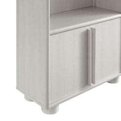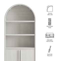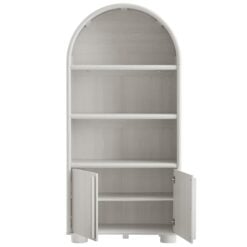 Blending contemporary design with functional elegance, the Bellamy Bookshelf Cabinet creates a refined storage and display solution for living rooms, home offices, and dining spaces. Featuring a graceful arched silhouette, this tall bookshelf cabinet makes a stylish statement while offering ample space for showcasing decor, books, and storage essentials. Crafted with a beautiful wood grain finish, this bookcase is designed with distinctive elongated handle pulls and unique rounded feet, adding a touch of modern sophistication. The open shelving provides ample display space, while the soft-close doors conceal an adjustable shelf for versatile concealed storage options. Thoughtfully designed with non-marking floor glides for stability and floor protection, this versatile display cabinet is perfect for any space. Assembly required.