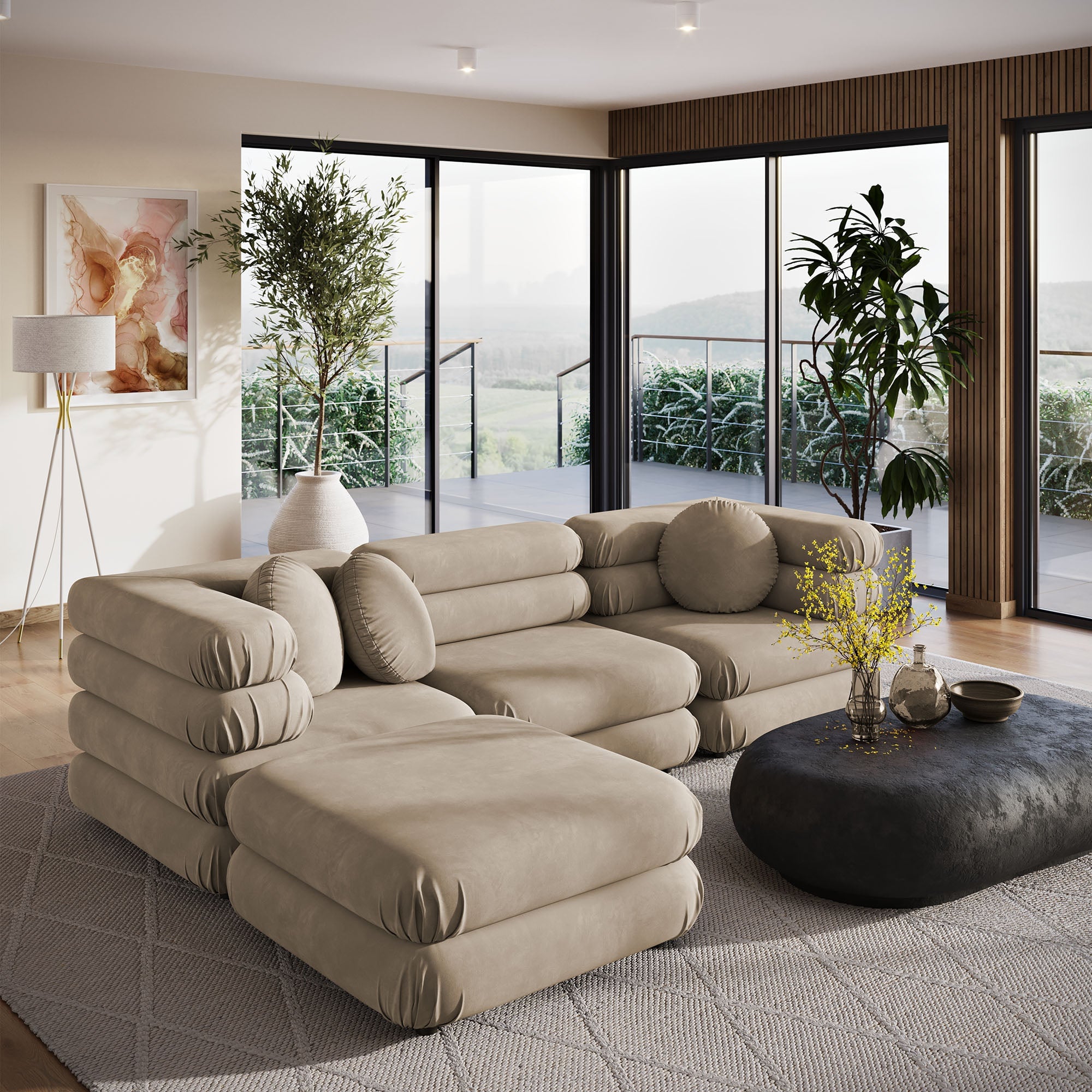 Reimagine your living space with the Jubilee Modular Sectional Sofa with Ottoman, a striking blend of retro flair and modern comfort. With its sleek design, the Jubilee 4-Piece Modular Sofa provides a spacious seating experience without compromising on style. This set includes one ottoman, two corner chairs, and one armless chair that connect with alligator clamp couch connectors, keeping them securely in place or allowing you to separate them as needed. Draped in stain-resistant performance velvet fabric, this comfy sofa exudes a luxurious feel with its dense foam padding and intricate detailing. The thick, gently tufted cushions are arranged in layers, creating a plush, stacked appearance with rounded edges for a cozy feel. The included three round pillows enhance both comfort and vintage charm, making this performance velvet upholstered modular sofa an inviting spot to relax. With premium zigzag spring pocket coils for robust support and comfort, Jubilee is the perfect oversized living room sofa or comfy sectional couch for hours of lounging. Equipped with plastic foot pads to protect your floors, this 4 piece modular sofa with ottoman is the retro fabric couch your modern decor needs. Assembly Required.