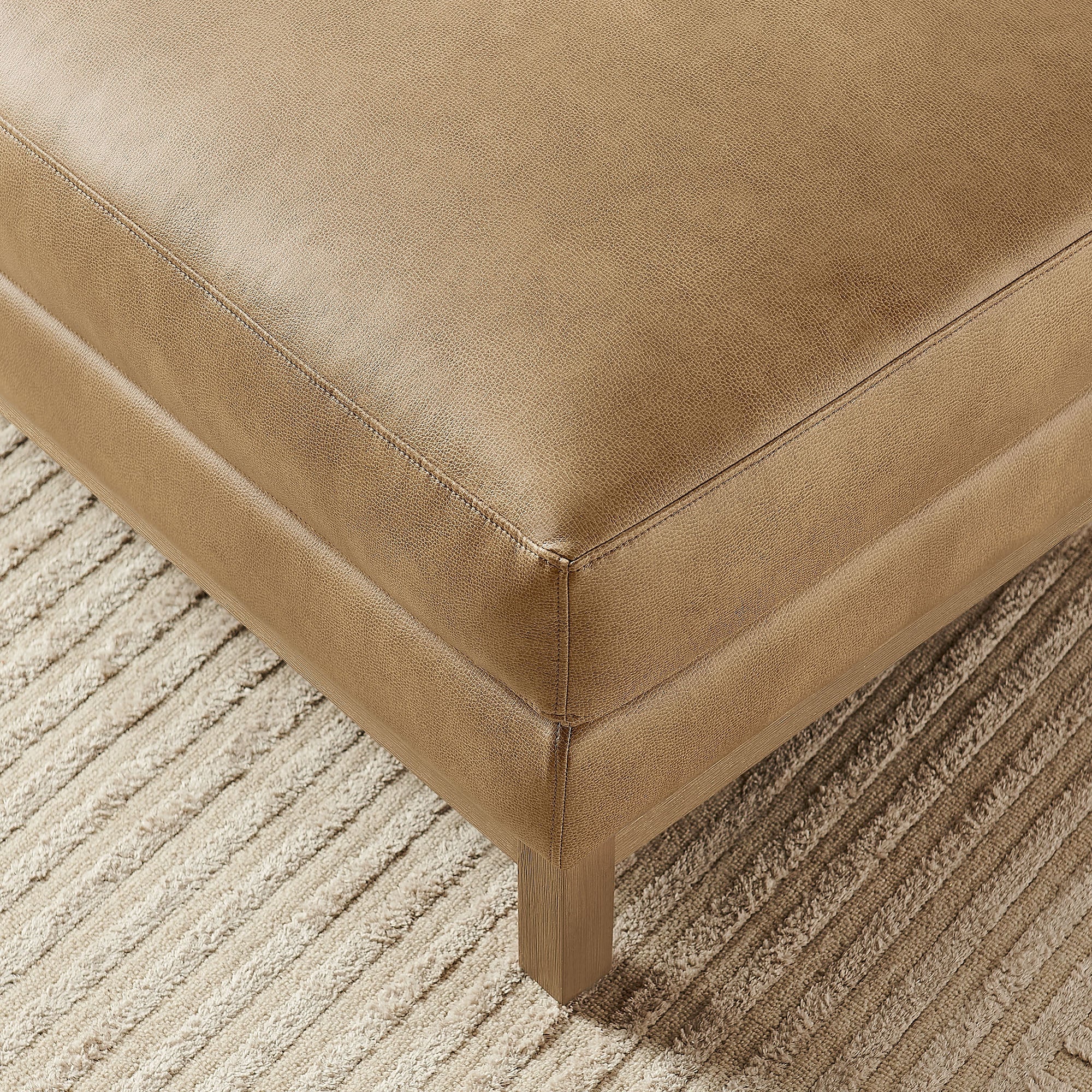 Refined lines and enduring design shape the Roscoe Rectangular Ottoman, a tailored take on American-traditional style. Upholstered in smooth vegan leather, this modern ottoman features a plush, supportive top with a pocket coil and sinuous spring foundation that adds subtle resilience beneath your feet. The low, streamlined profile sits atop a kiln-dried weathered wood frame with integrated legs and non-marking foot caps for added stability and floor protection. A versatile rectangular ottoman for both modern and classic interiors, Roscoe works beautifully as a faux leather footstool or extra seating in any living room setting. Weight Capacity: 800 lbs.