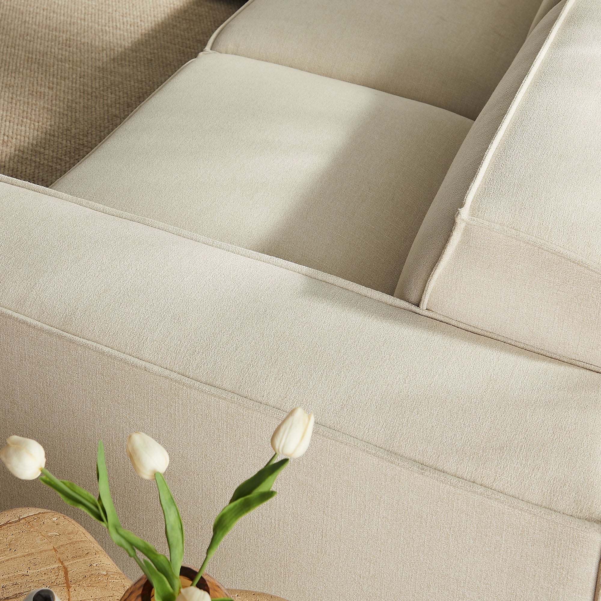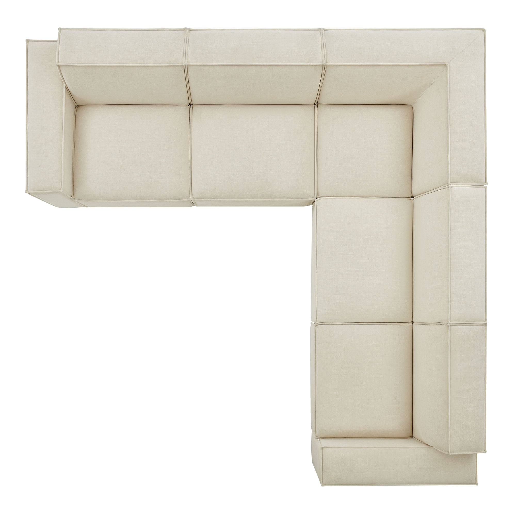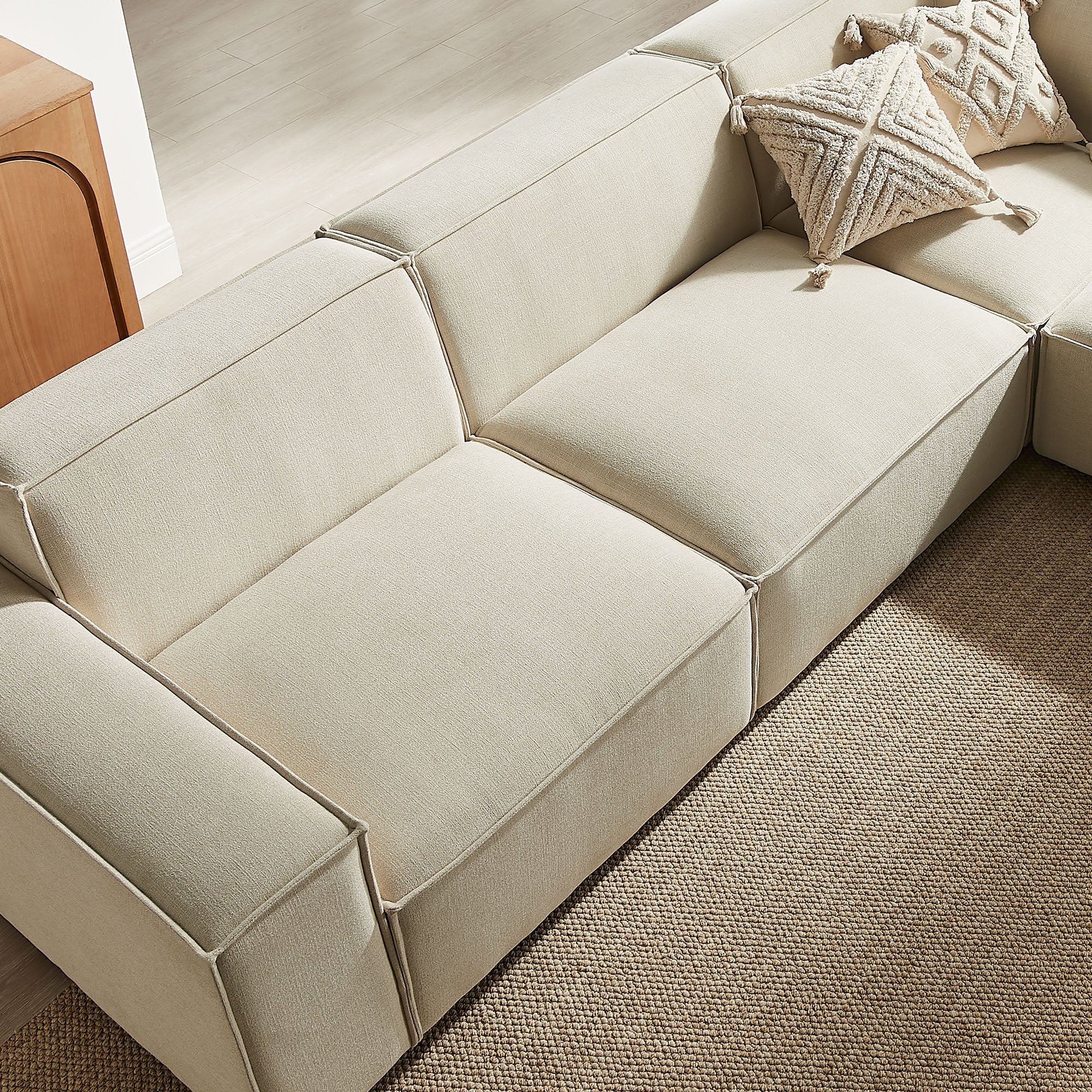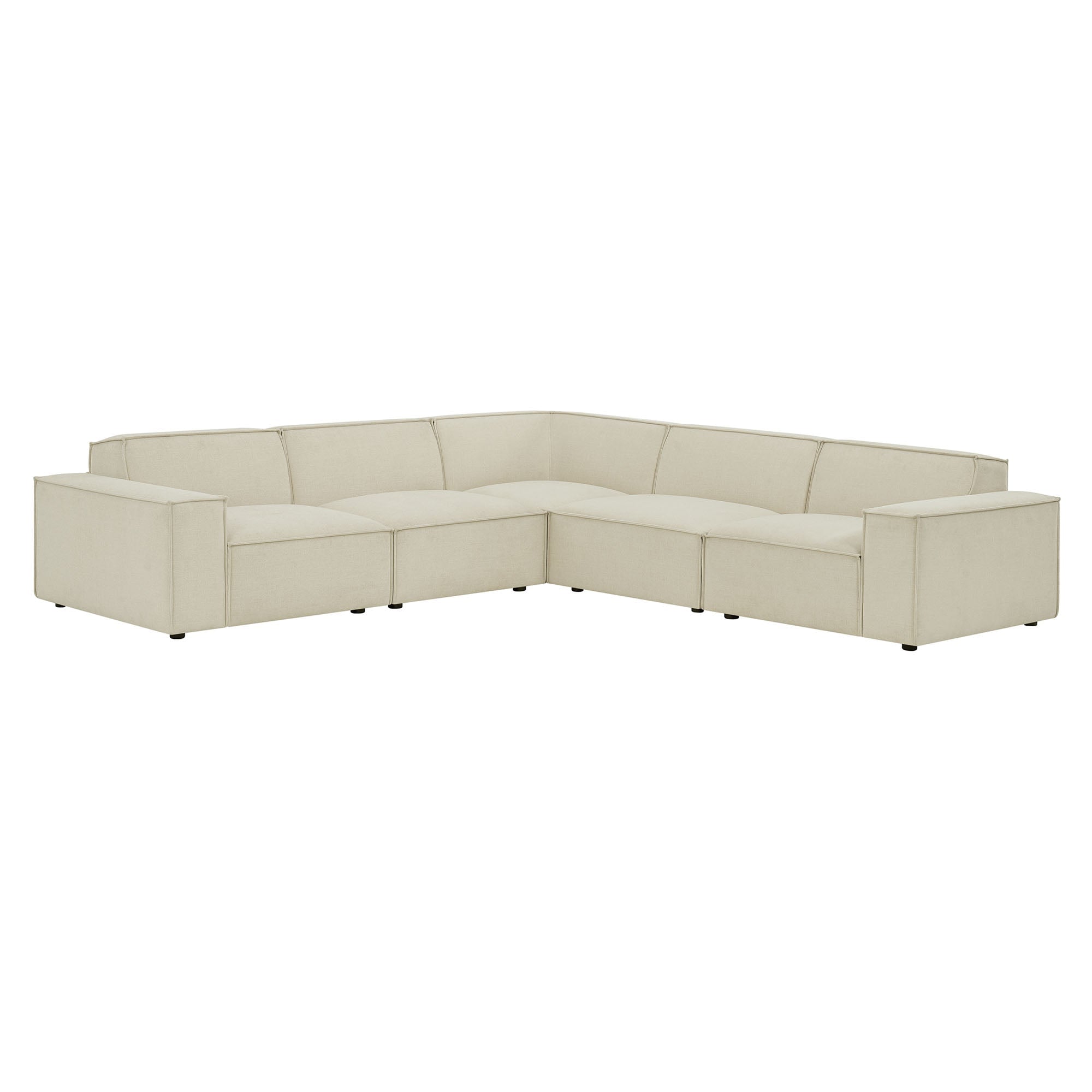 Create your custom living room and lounge area with the Restore Upholstered Fabric 5-Piece Sectional Sofa. The Restore Sectional Couch brings minimalist appeal with a crisp silhouette, broad lines, and French piping details wrapped in soft fabric upholstery. Featuring a high-performance upholstery fabric designed to repel water-based spills and stains—most messes blot away easily with a clean cloth. For stubborn residue, spray with a diluted dish soap solution and blot clean. Dense foam padding and a pocket coil spring system in each seat offer a comfortable, supportive feel for everyday lounging. Designed to form an L-shaped layout, this modular set includes one left-facing armless chair, one right-facing armless chair, two armless chairs, and one corner chair. Built-in connectors allow the pieces to stay securely in place and make it easy to expand over time with other Restore pieces. Built on a sturdy wood-blend frame with non-marking foot caps to help protect floors.