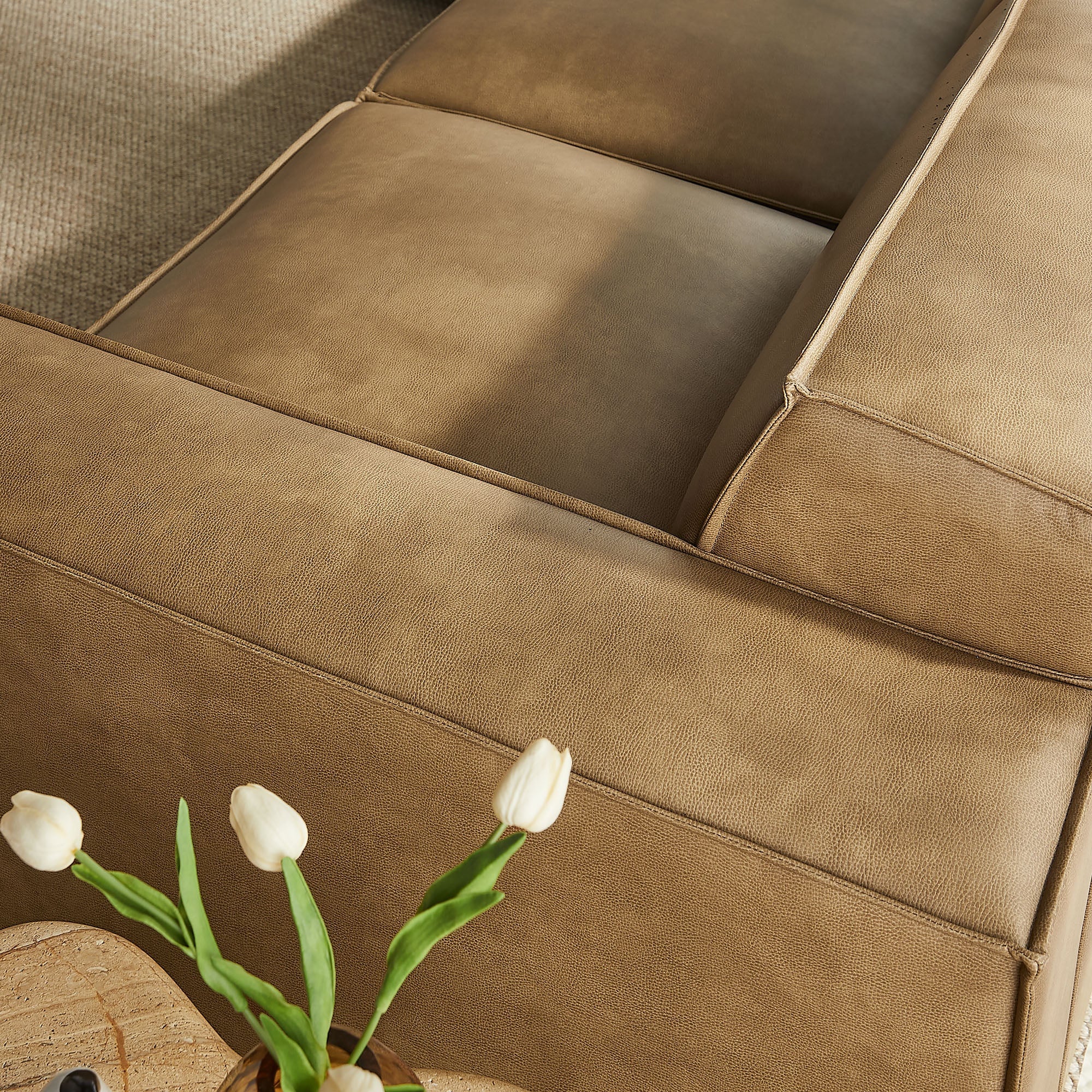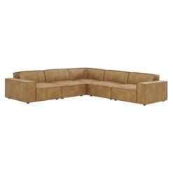 Create your custom living room and lounge area with the Restore Vegan Leather 5-Piece Sectional Sofa. The Restore Sectional Couch features a clean, modern profile with broad lines and French piping details wrapped in soft vegan leather upholstery. Dense foam padding and a pocket coil spring system in each seat offer comfortable, supportive seating for everyday use. Designed to form an L-shaped layout, this modular set includes one left-facing armless chair, one right-facing armless chair, two armless chairs, and one corner chair. Built-in connectors keep the pieces aligned and allow you to add on over time with other Restore pieces. Built on a sturdy wood-blend frame with non-marking foot caps to help protect floors.