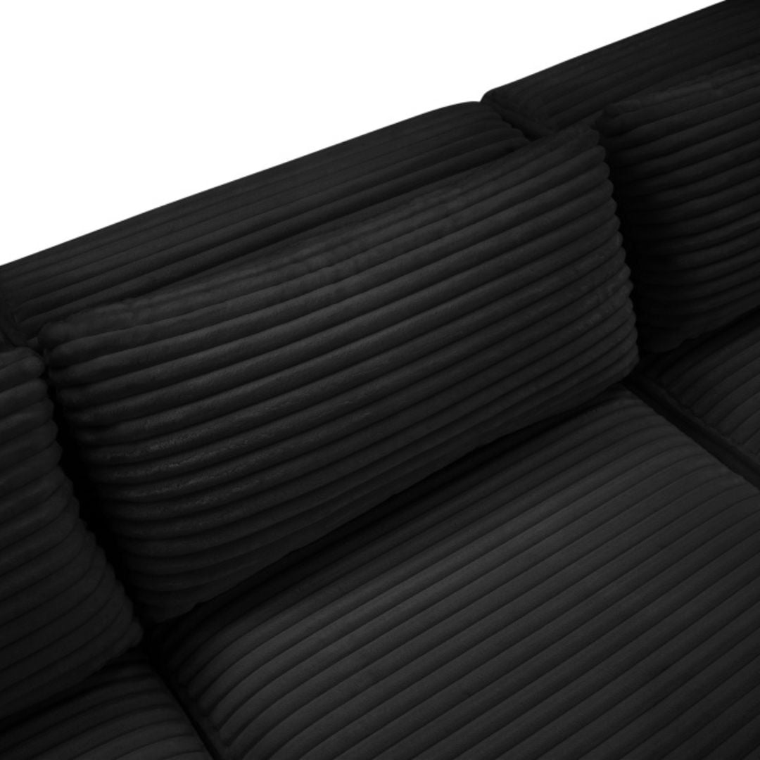 Indulge in luxurious and supreme comfort with the Shaggy black corduroy performance fabric upholstered modular sofa, featuring soft furry-textured corduroy fabric with bold 1-inch-wide wales. Designed for both style and durability, this performance fabric is water-repellent and stain-resistant, ensuring long-lasting beauty. The comfortable foam seating offers plush support, while its modular design allows for infinite configurations to suit your space with a secure latch underneath to add more pieces.