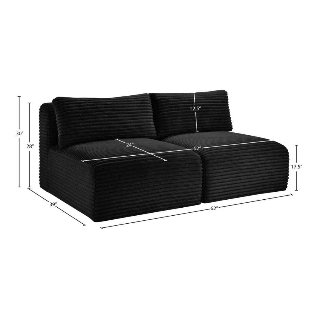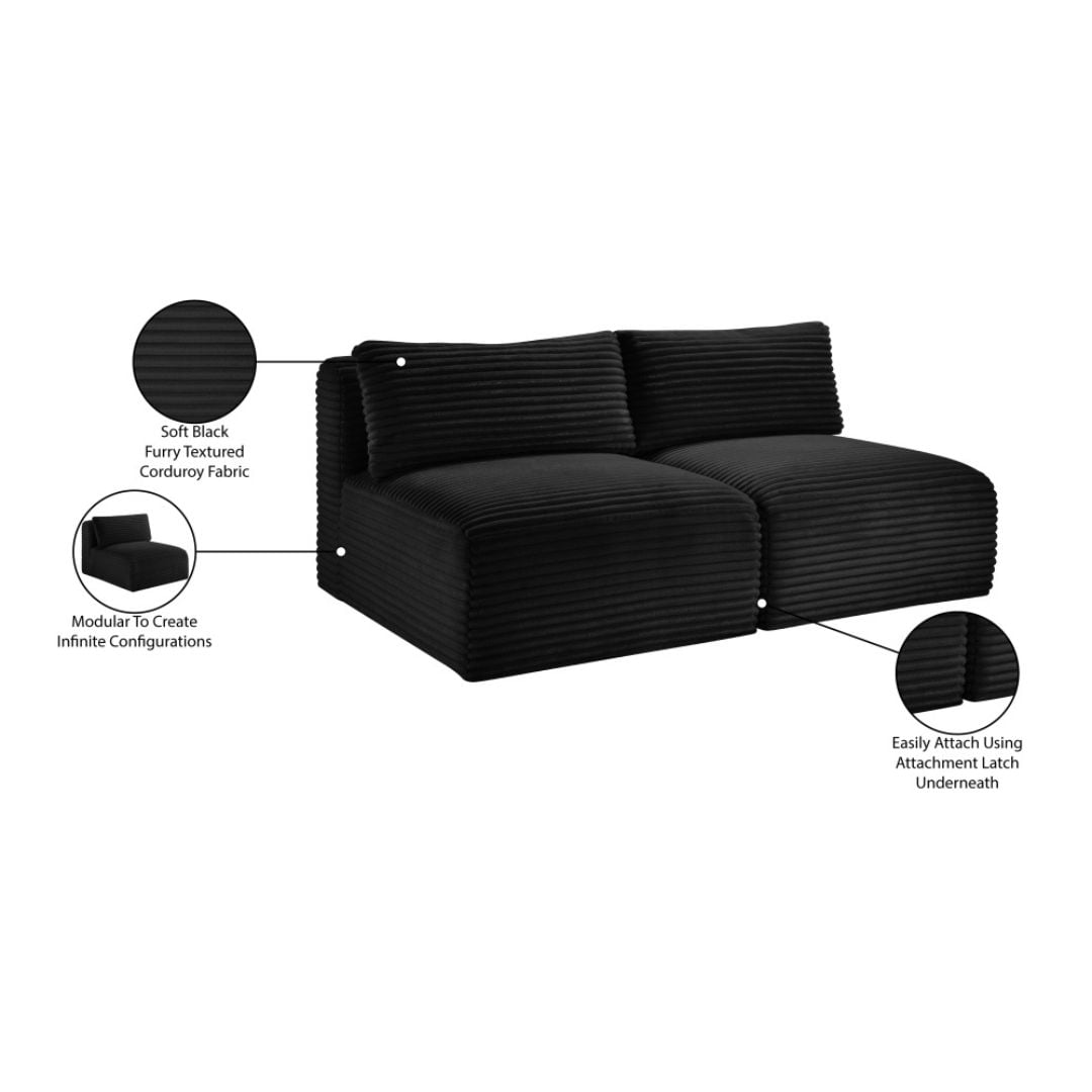 Indulge in luxurious and supreme comfort with the Shaggy black corduroy performance fabric upholstered modular loveseat, featuring soft furry-textured corduroy fabric with bold 1-inch-wide wales. Designed for both style and durability, this performance fabric is water-repellent and stain-resistant, ensuring long-lasting beauty. The comfortable foam seating offers plush support, while its modular design allows for infinite configurations to suit your space with a secure latch underneath to add more pieces.