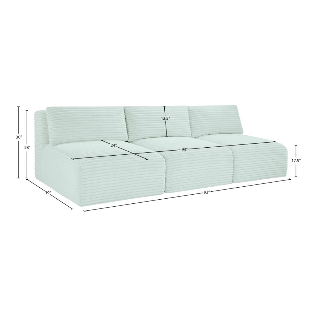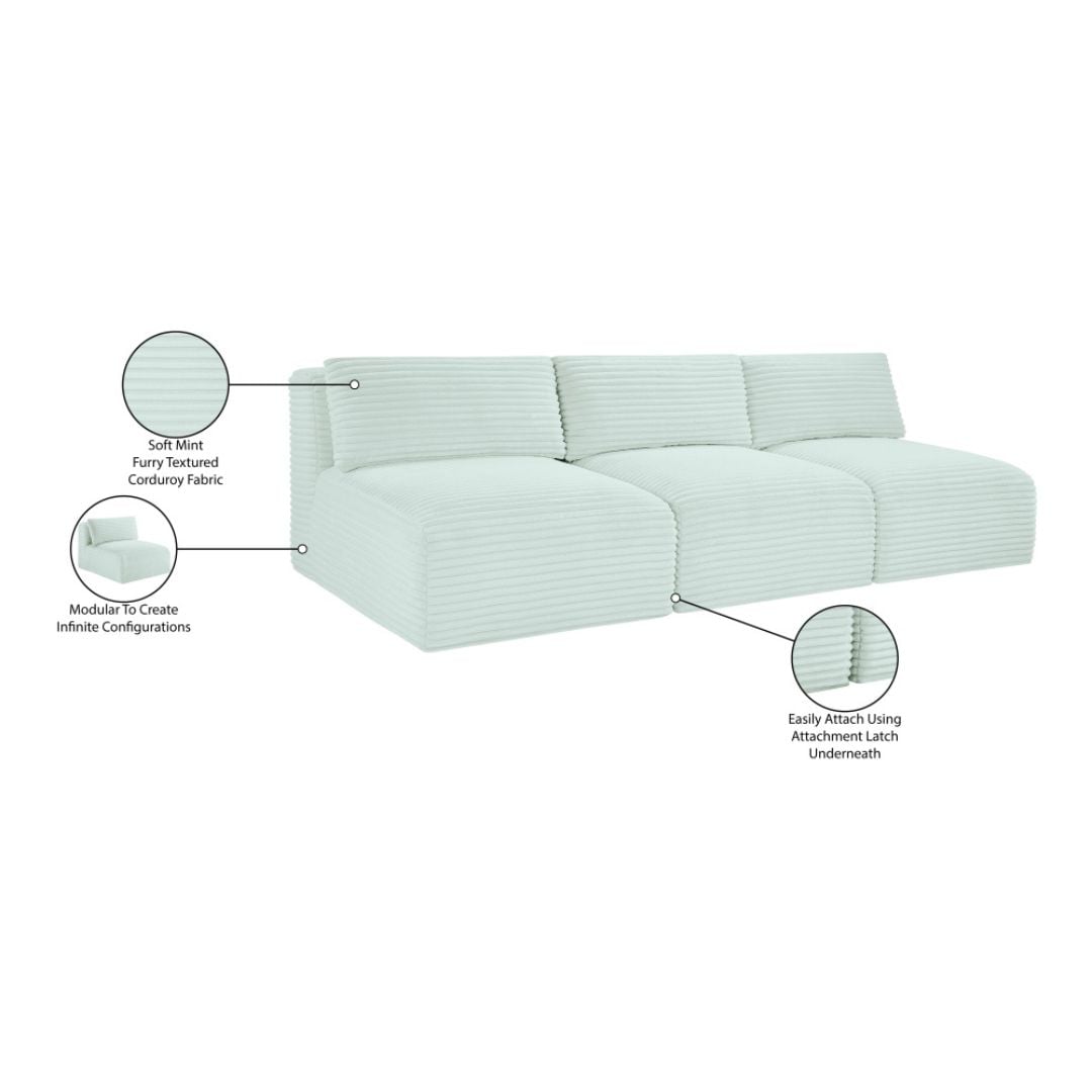 Indulge in luxurious and supreme comfort with the Shaggy mint corduroy performance fabric upholstered modular sofa, featuring soft furry-textured corduroy fabric with bold 1-inch-wide wales. Designed for both style and durability, this performance fabric is water-repellent and stain-resistant, ensuring long-lasting beauty. The comfortable foam seating offers plush support, while its modular design allows for infinite configurations to suit your space with a secure latch underneath to add more pieces.