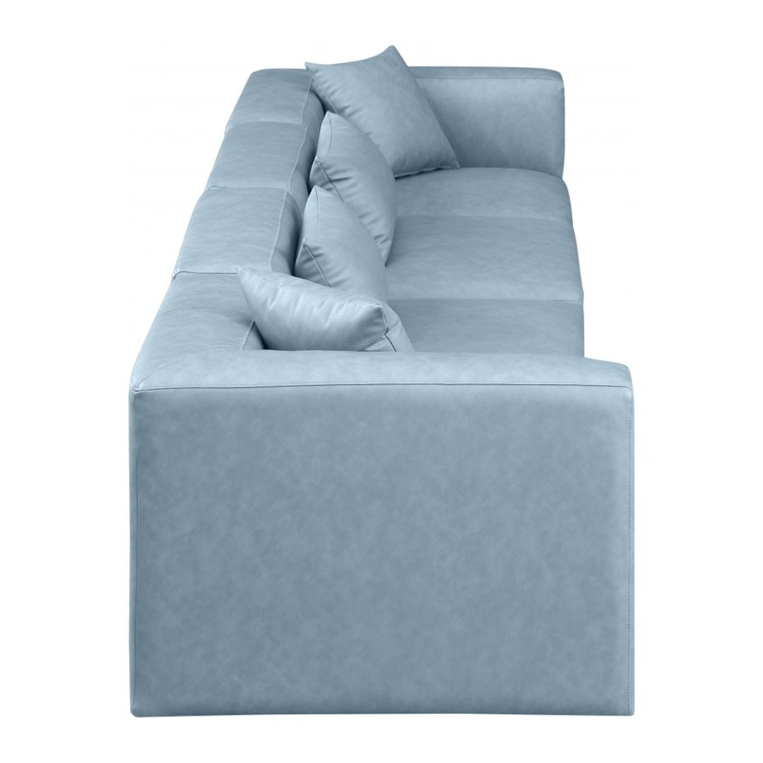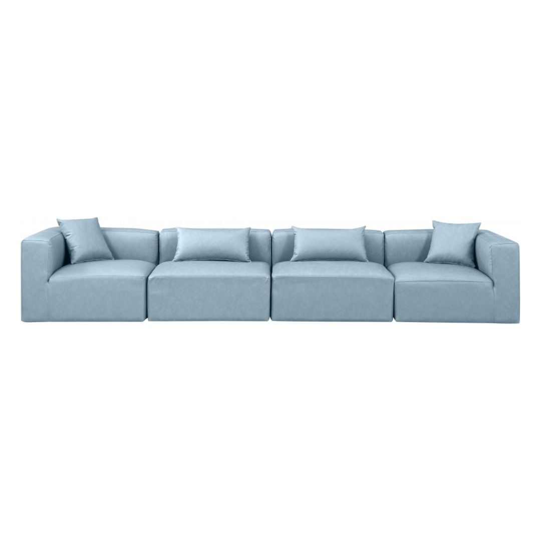 Elevate your space with the luxurious Cube Vegan Leather Modular Sofa. This modular sofa exudes modern elegance, charm, and comfort making it a perfect addition to any contemporary living space. Its clean lines and cube shape are reminiscent of minimalist design, while the plush light blue vegan leather upholstery adds a touch of luxury and sophistication. The chair’s versatile construction and geometric aesthetic seamlessly integrate into various design styles, from sleek living rooms to chic home offices, embodying the essence of modern design and creating a sense of order and tranquility in your space.