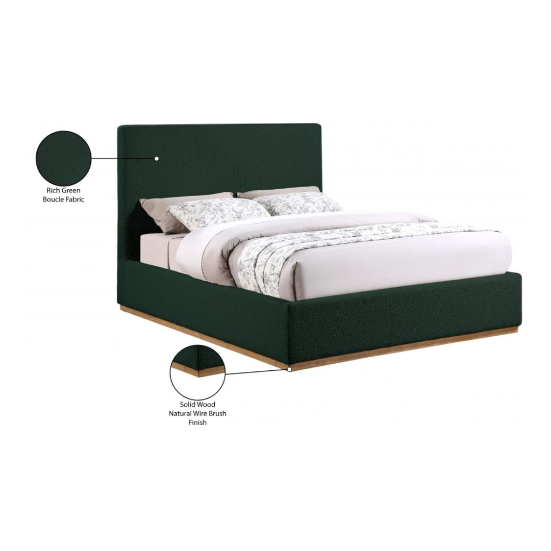 Give your bedroom a contemporary makeover with this Monaco full bed. Featuring a solid wood natural wire brush finish and rich green boucle fabric upholstery, this full-size bed is perfect for any bedroom. Its frame is crafted from rubber wood and is covered with boucle fabric, giving it an elegant touch. Its contemporary design complements existing modern decor. Use this bed as a bold centerpiece for your bedroom, or pair it with matching furniture to complete your bedroom’s contemporary look.