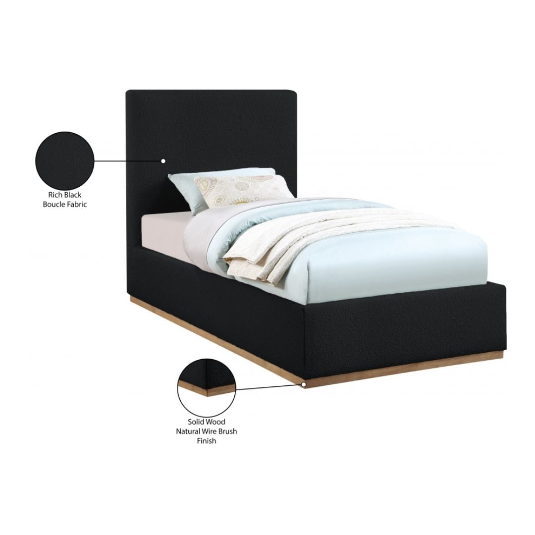 Give your bedroom a contemporary makeover with this Monaco twin bed. Featuring a solid wood natural wire brush finish and rich black boucle fabric upholstery, this twin-size bed is perfect for any bedroom. Its frame is crafted from rubber wood and is covered with boucle fabric, giving it an elegant touch. Its contemporary design complements existing modern decor. Use this bed as a bold centerpiece for your bedroom, or pair it with matching furniture to complete your bedroom’s contemporary look.