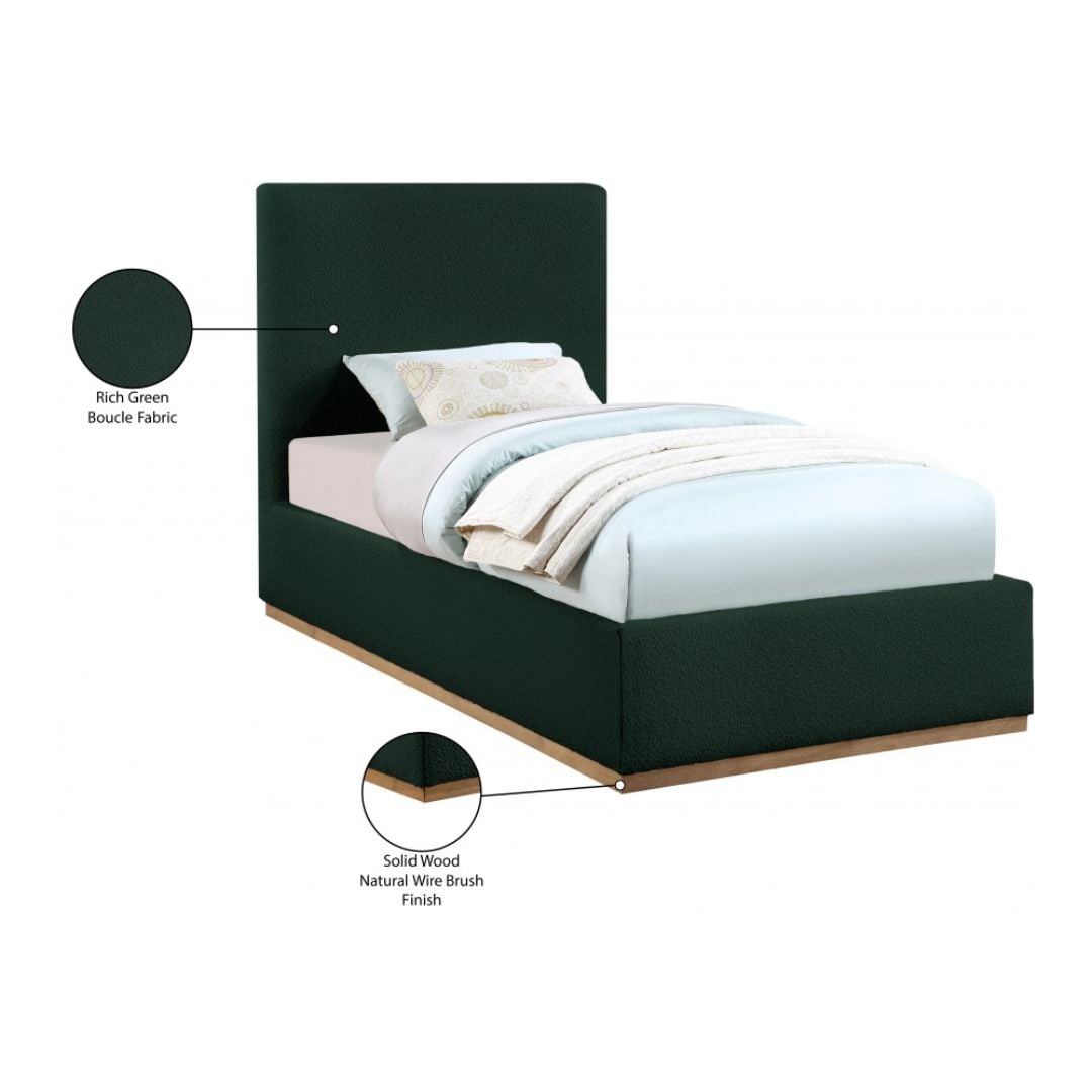 Give your bedroom a contemporary makeover with this Monaco twin bed. Featuring a solid wood natural wire brush finish and rich green boucle fabric upholstery, this twin-size bed is perfect for any bedroom. Its frame is crafted from rubber wood and is covered with boucle fabric, giving it an elegant touch. Its contemporary design complements existing modern decor. Use this bed as a bold centerpiece for your bedroom, or pair it with matching furniture to complete your bedroom’s contemporary look.