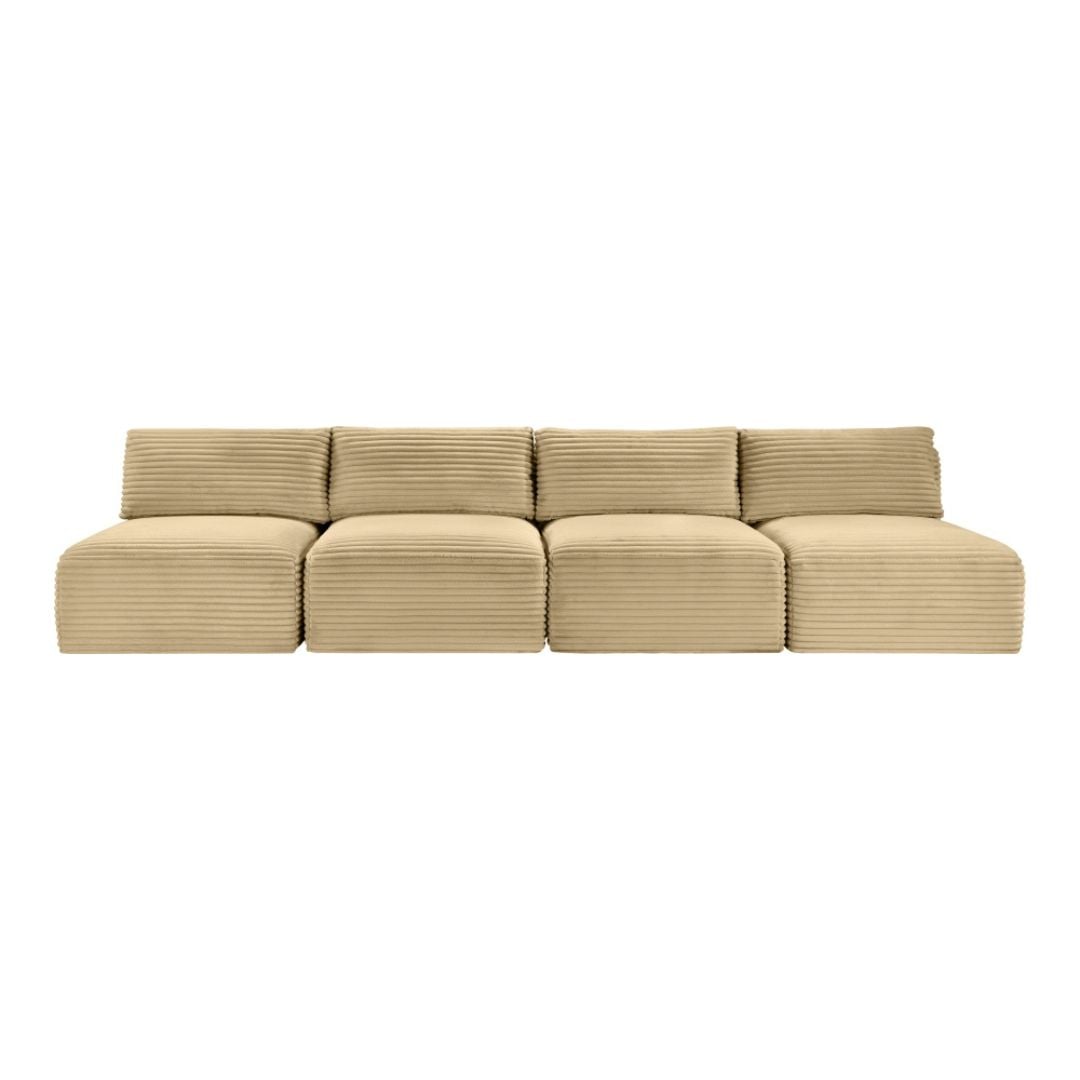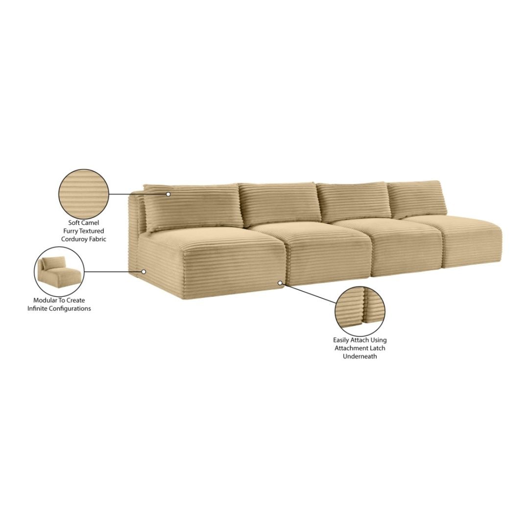 Indulge in luxurious and supreme comfort with the Shaggy camel corduroy performance fabric upholstered modular sofa, featuring soft furry-textured corduroy fabric with bold 1-inch-wide wales. Designed for both style and durability, this performance fabric is water-repellent and stain-resistant, ensuring long-lasting beauty. The comfortable foam seating offers plush support, while its modular design allows for infinite configurations to suit your space with a secure latch underneath to add more pieces.