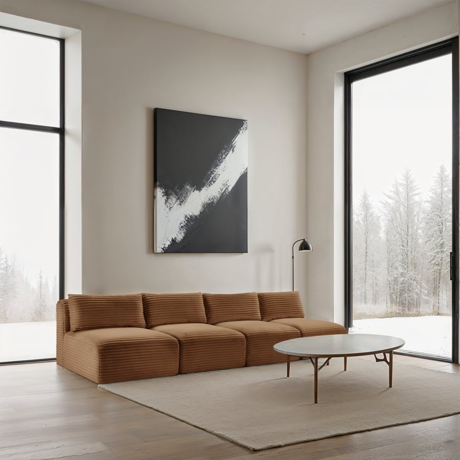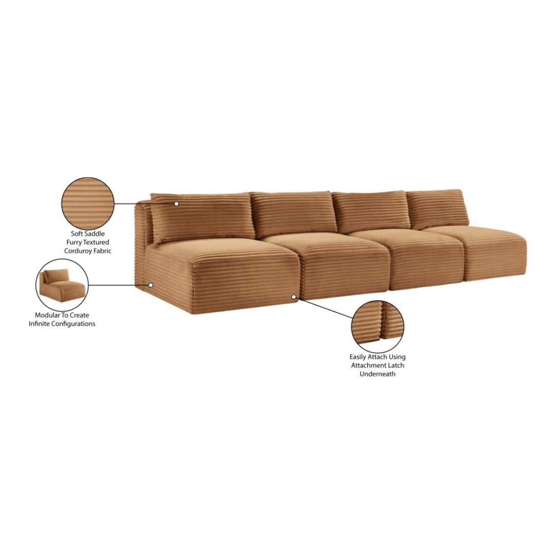 Indulge in luxurious and supreme comfort with the Shaggy saddle corduroy performance fabric upholstered modular sofa, featuring soft furry-textured corduroy fabric with bold 1-inch-wide wales. Designed for both style and durability, this performance fabric is water-repellent and stain-resistant, ensuring long-lasting beauty. The comfortable foam seating offers plush support, while its modular design allows for infinite configurations to suit your space with a secure latch underneath to add more pieces.