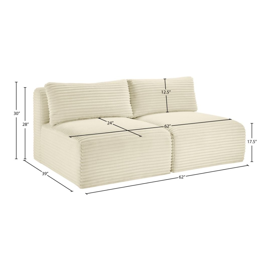 Indulge in luxurious and supreme comfort with the Shaggy cream corduroy performance fabric upholstered modular loveseat, featuring soft furry-textured corduroy fabric with bold 1-inch-wide wales. Designed for both style and durability, this performance fabric is water-repellent and stain-resistant, ensuring long-lasting beauty. The comfortable foam seating offers plush support, while its modular design allows for infinite configurations to suit your space with a secure latch underneath to add more pieces.