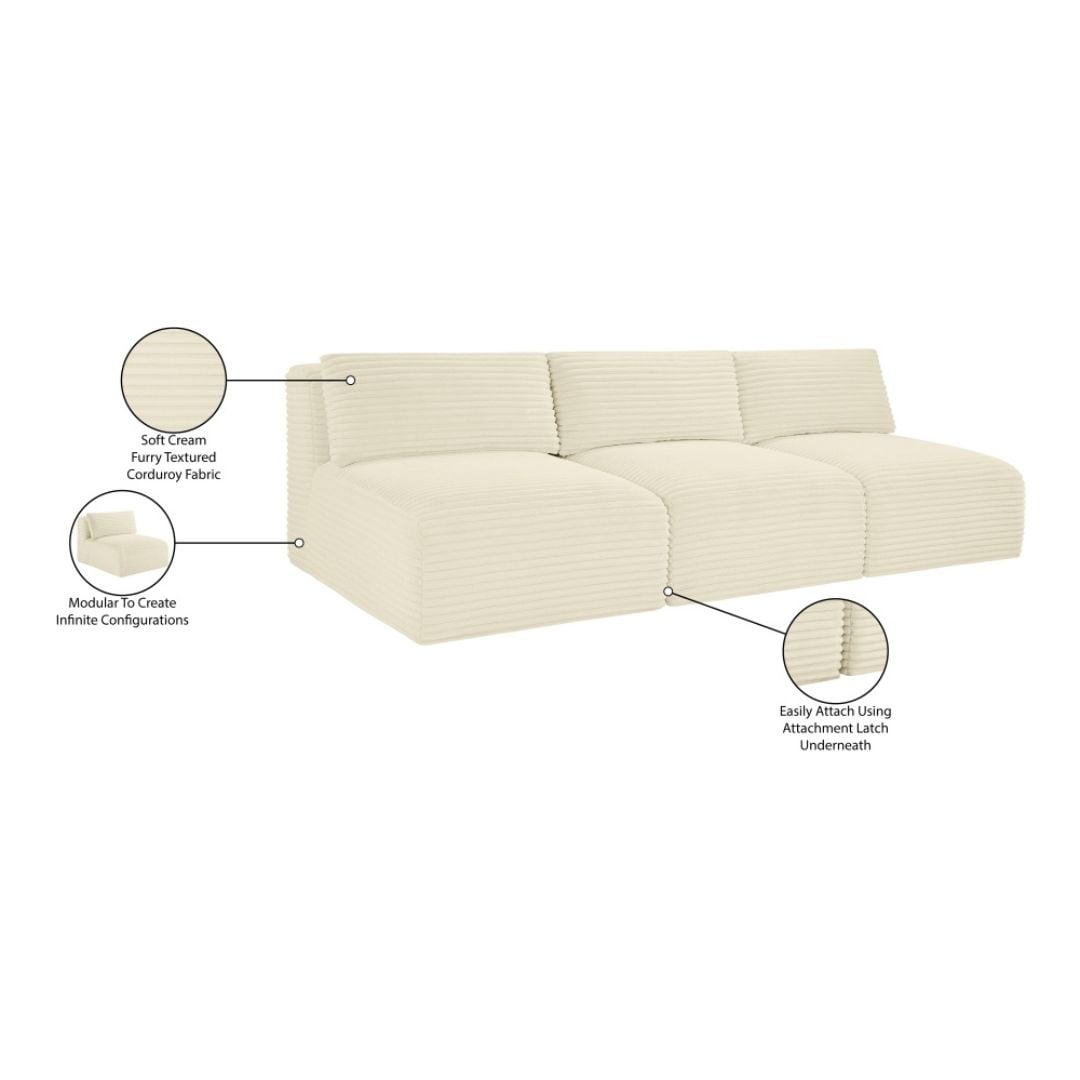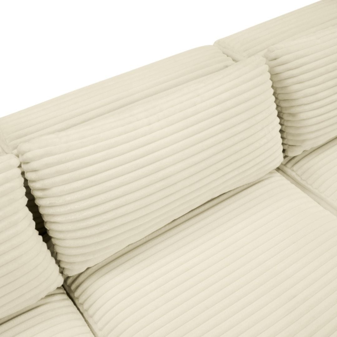 Indulge in luxurious and supreme comfort with the Shaggy cream corduroy performance fabric upholstered modular sofa, featuring soft furry-textured corduroy fabric with bold 1-inch-wide wales. Designed for both style and durability, this performance fabric is water-repellent and stain-resistant, ensuring long-lasting beauty. The comfortable foam seating offers plush support, while its modular design allows for infinite configurations to suit your space with a secure latch underneath to add more pieces.